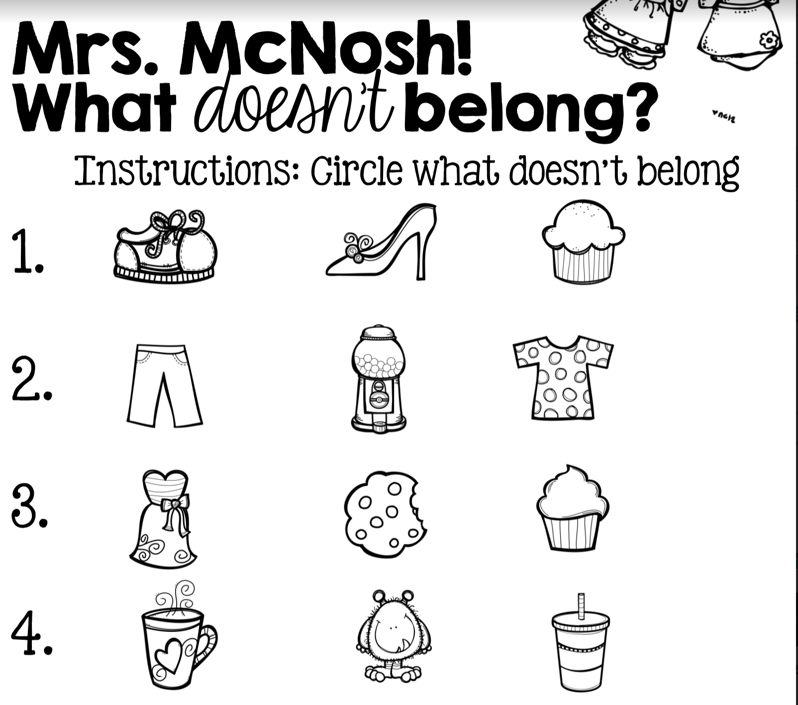 Can you find what doesn’t belong in this picture? Click here to color the pictures and circle what doesn’t belong. (Open PDF in preview to print. )