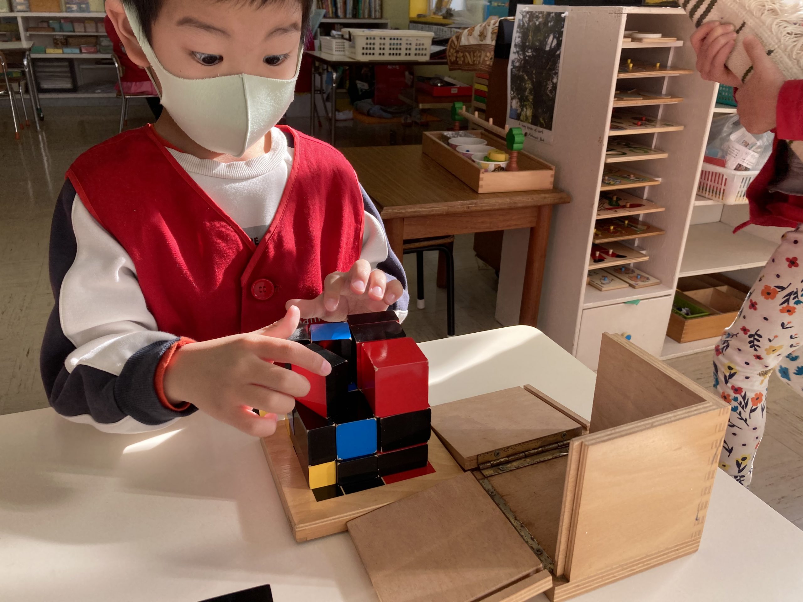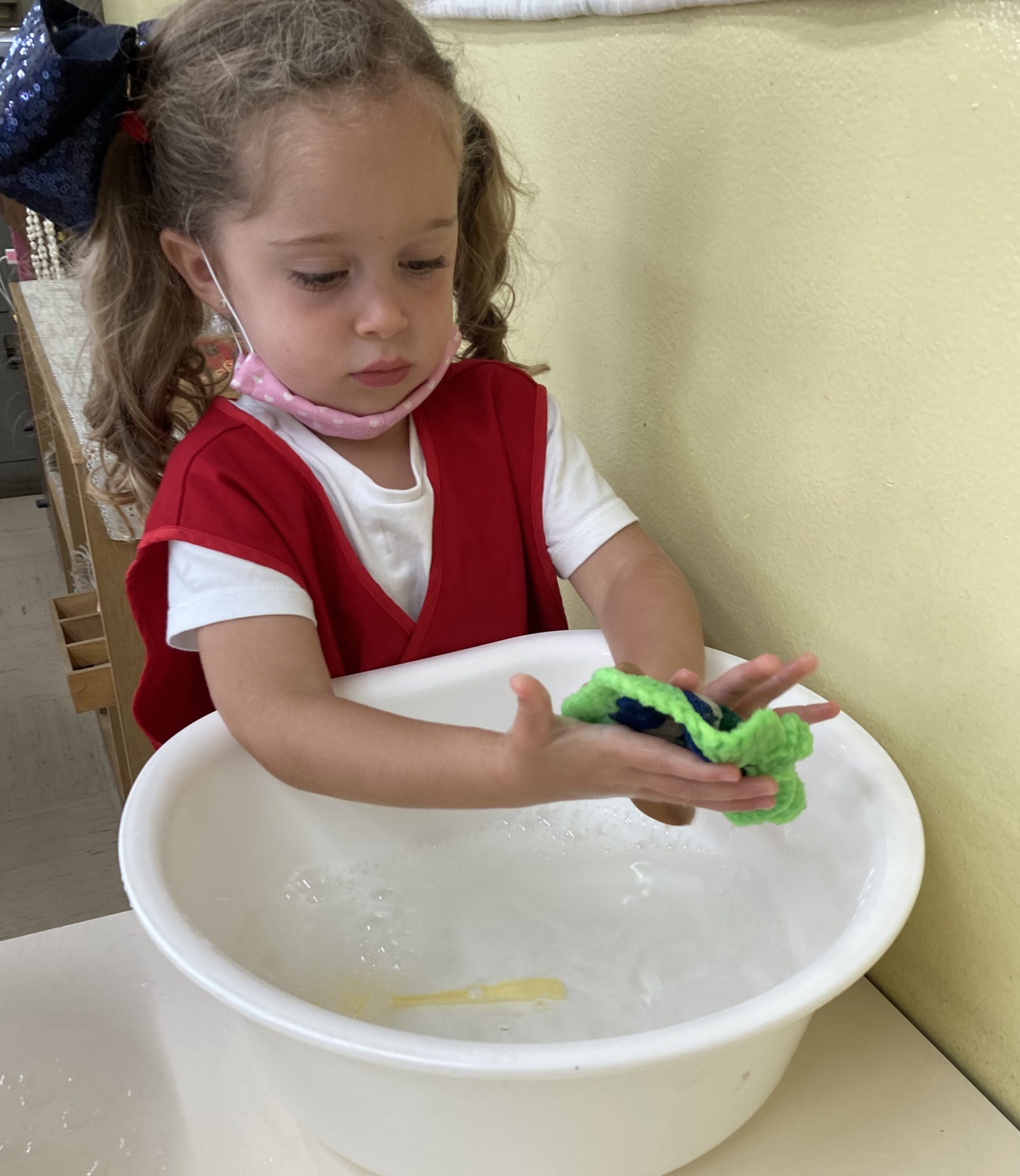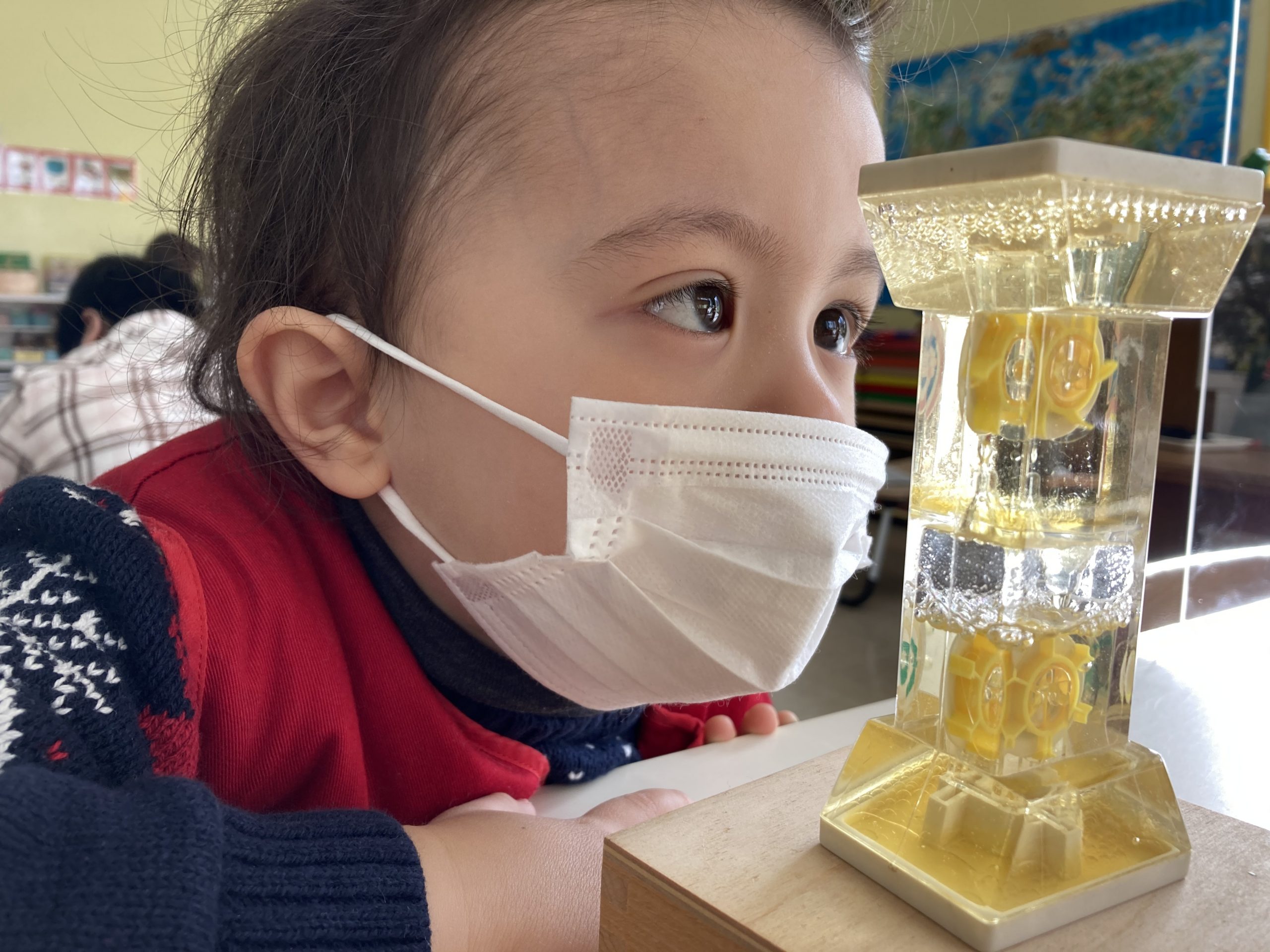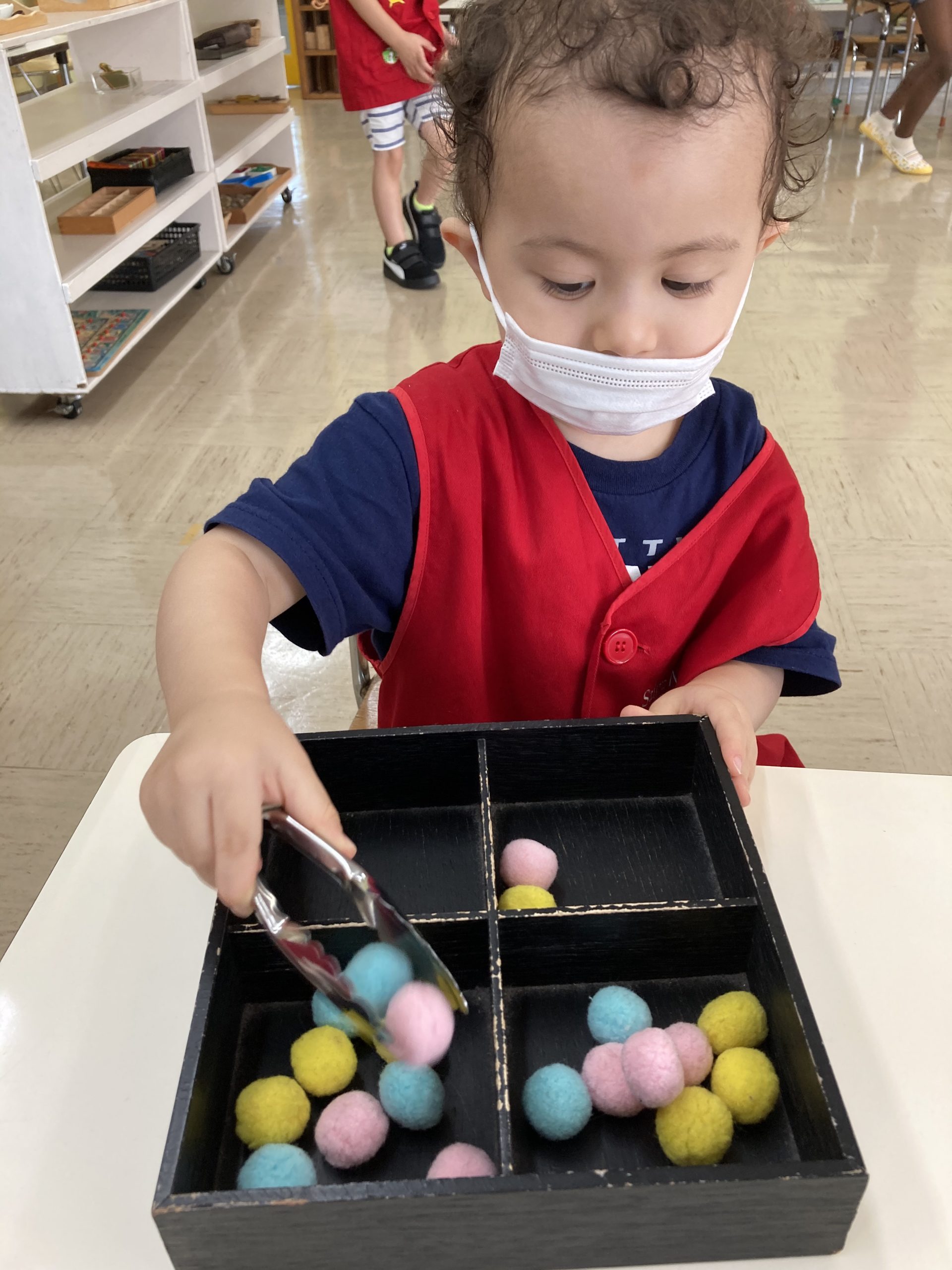 What did we learn over the last few weeks? Let’s see our classroom in action. A three-year-old carefully pouring beans from one jug to another, a part of Practical Life activity. Concentration and eye-hand coordination are developed.