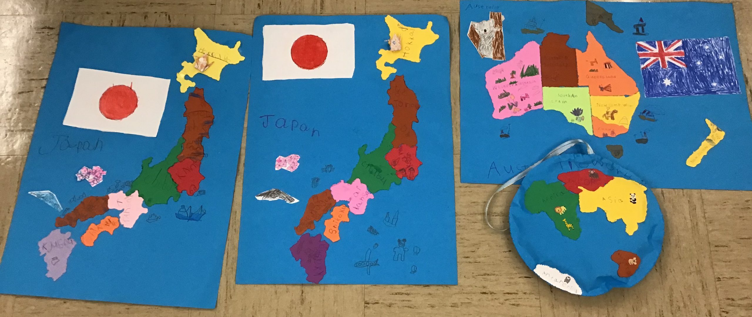 The continent of North America: Discovering the national flag after outlining the country with a pushpin, and pasting the parts together. The children did research along the way.