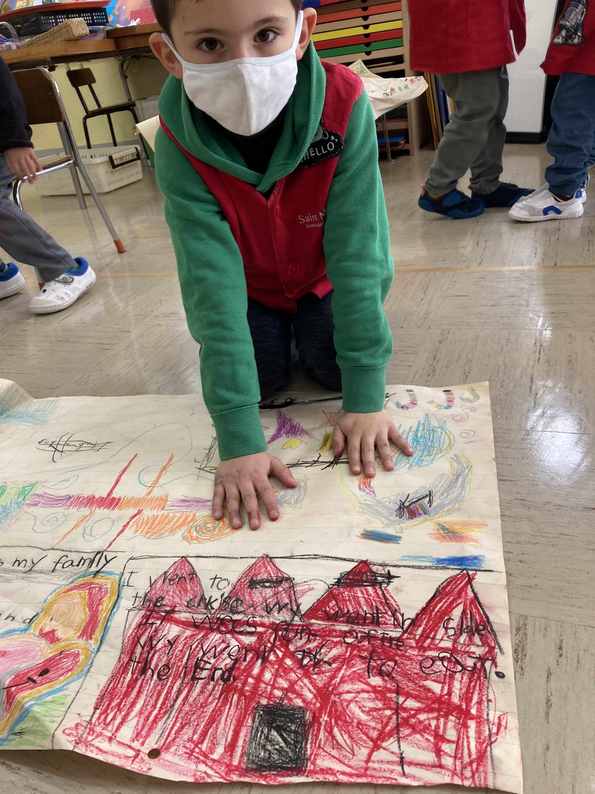 Drawing on the easel: Not only do children write words and sometimes stories on the easel, but they also like to express their creativity. This boy is writing about a “Cat Family”. The easel became a place where discussions started.