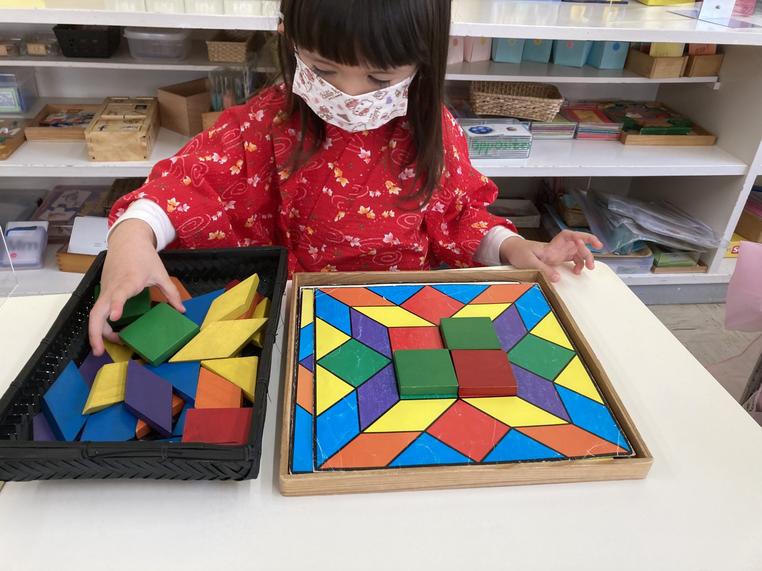 A child found the flag of her home country (Brazil) and her host country (Japan) while having her snack!   Learning the names of 10 shapes.
