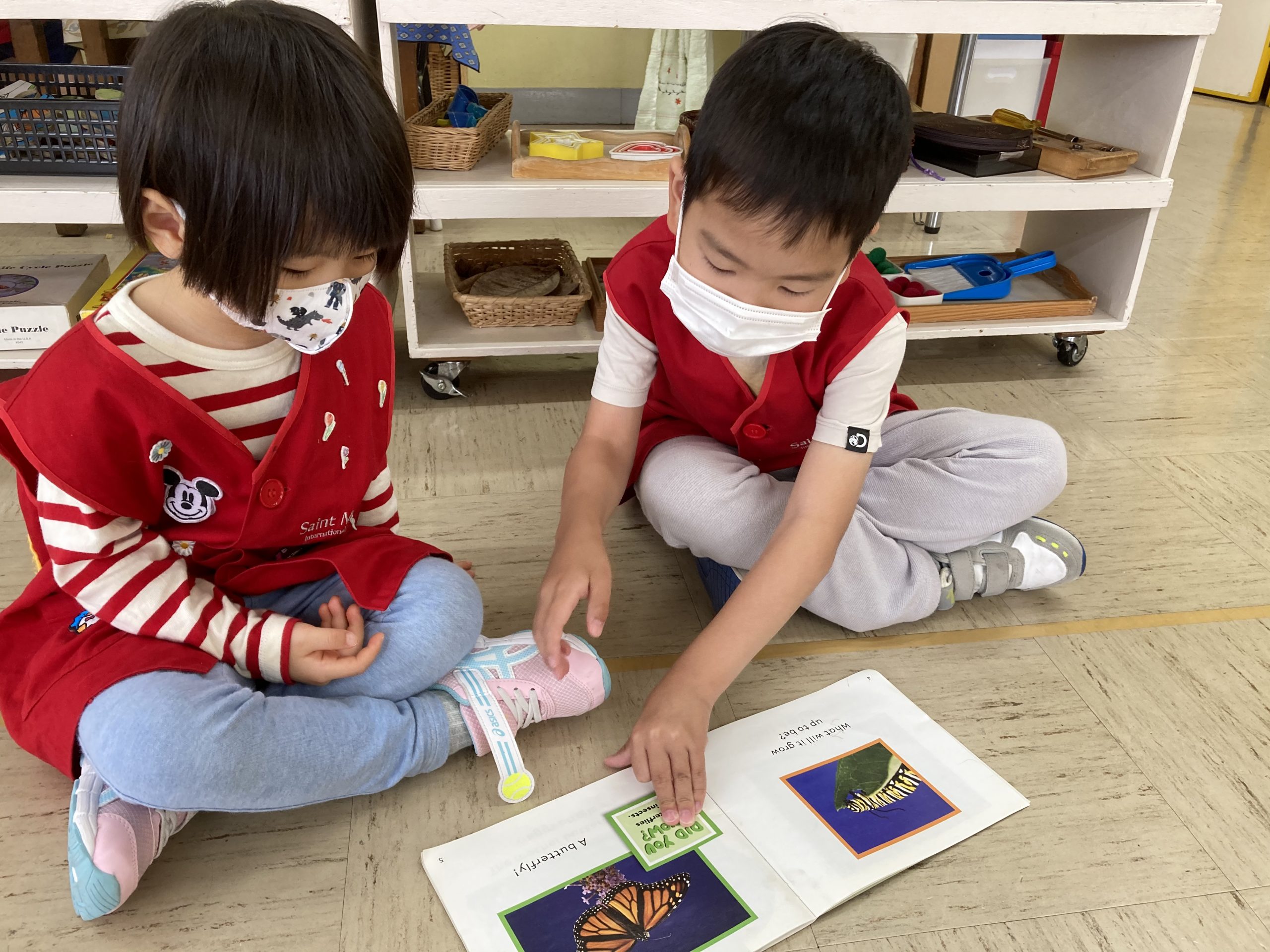 A 6-year-old reading a book to a younger child. He is also explaining to her about the picture of a butterfly.