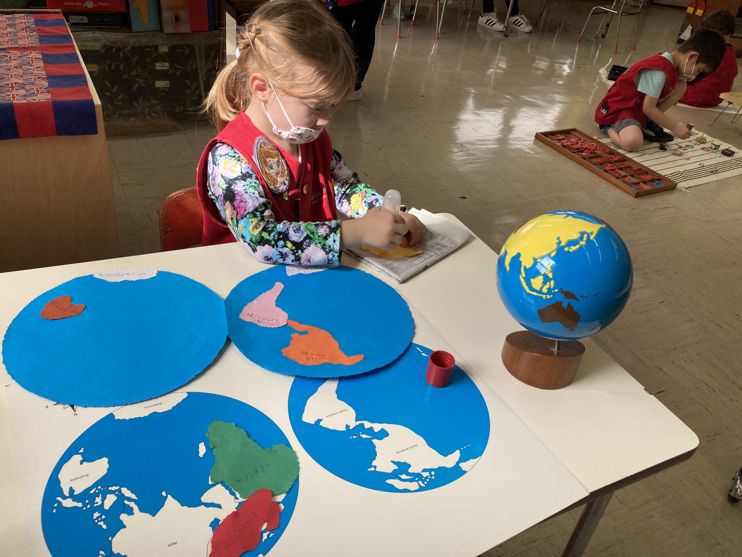Map-making, a popular activity in a Montessori classroom.  Making a continent globe, learning key facts as they pinned the outlines.