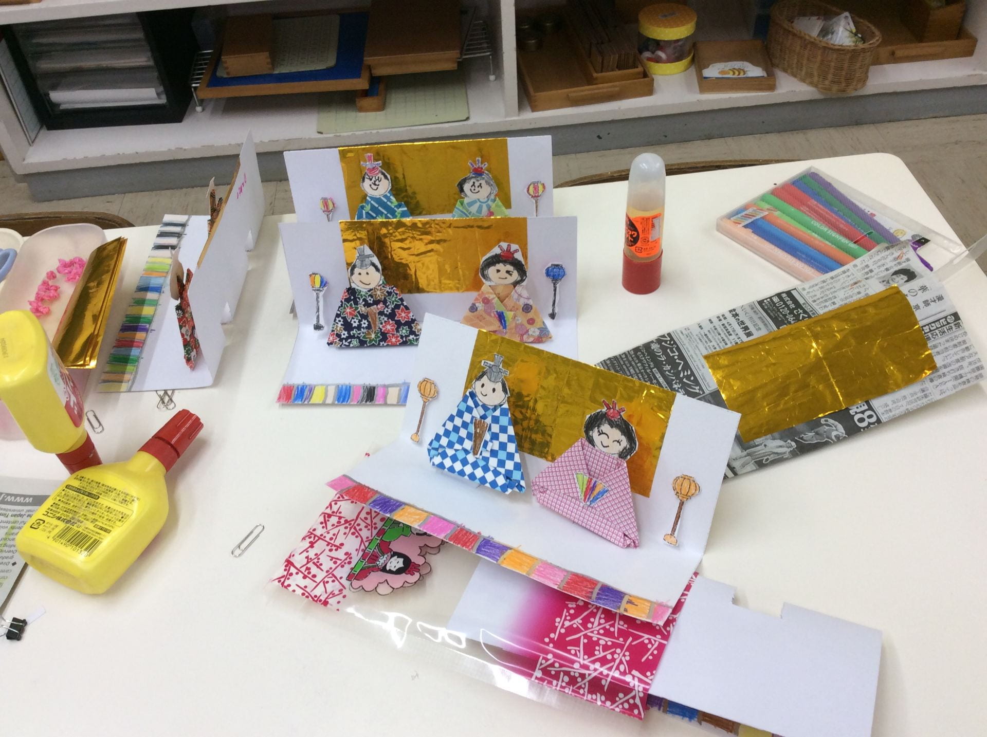 The children made a pop-up card using the cut-outs, and pasting golden origami paper as a screen.