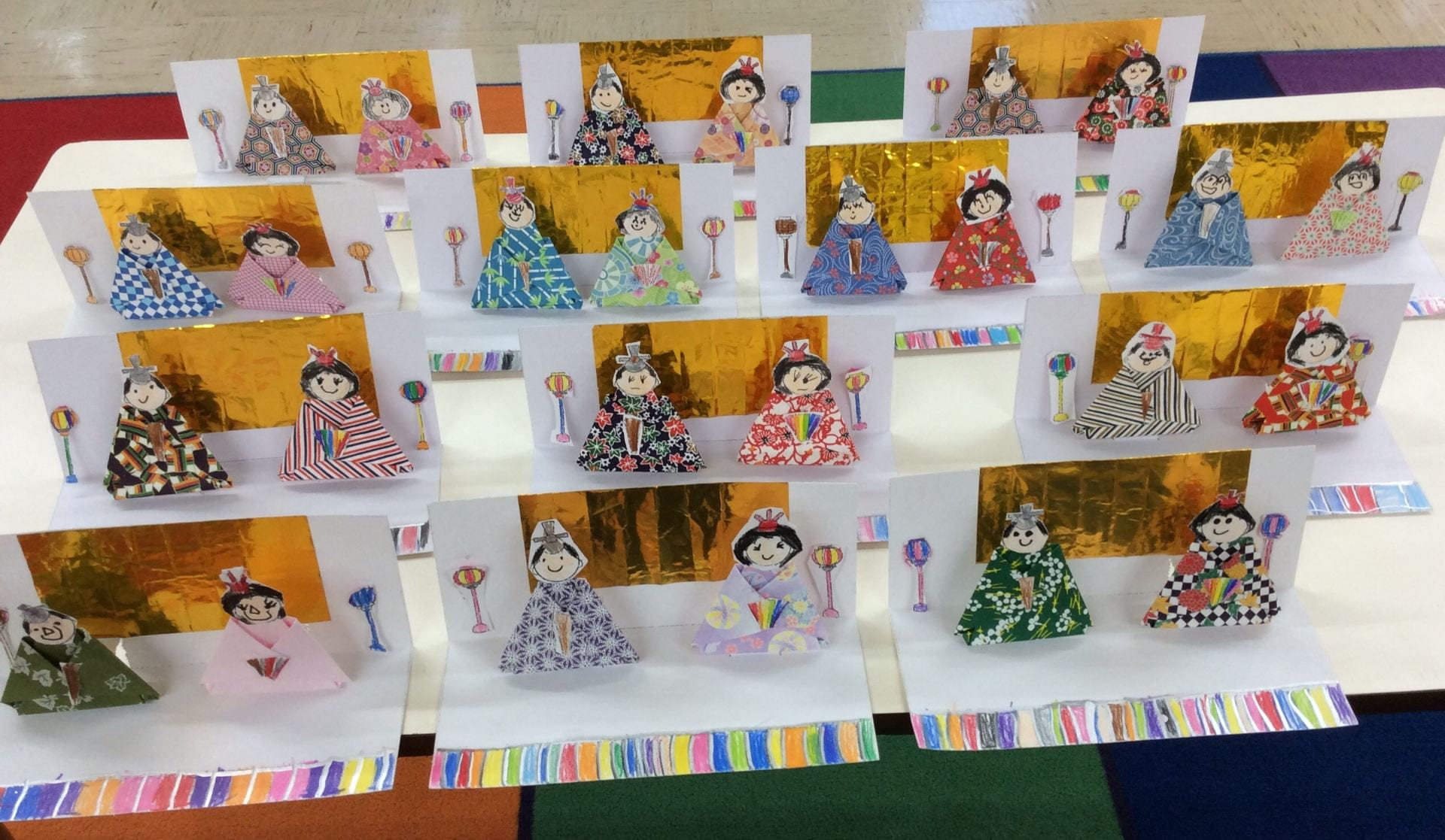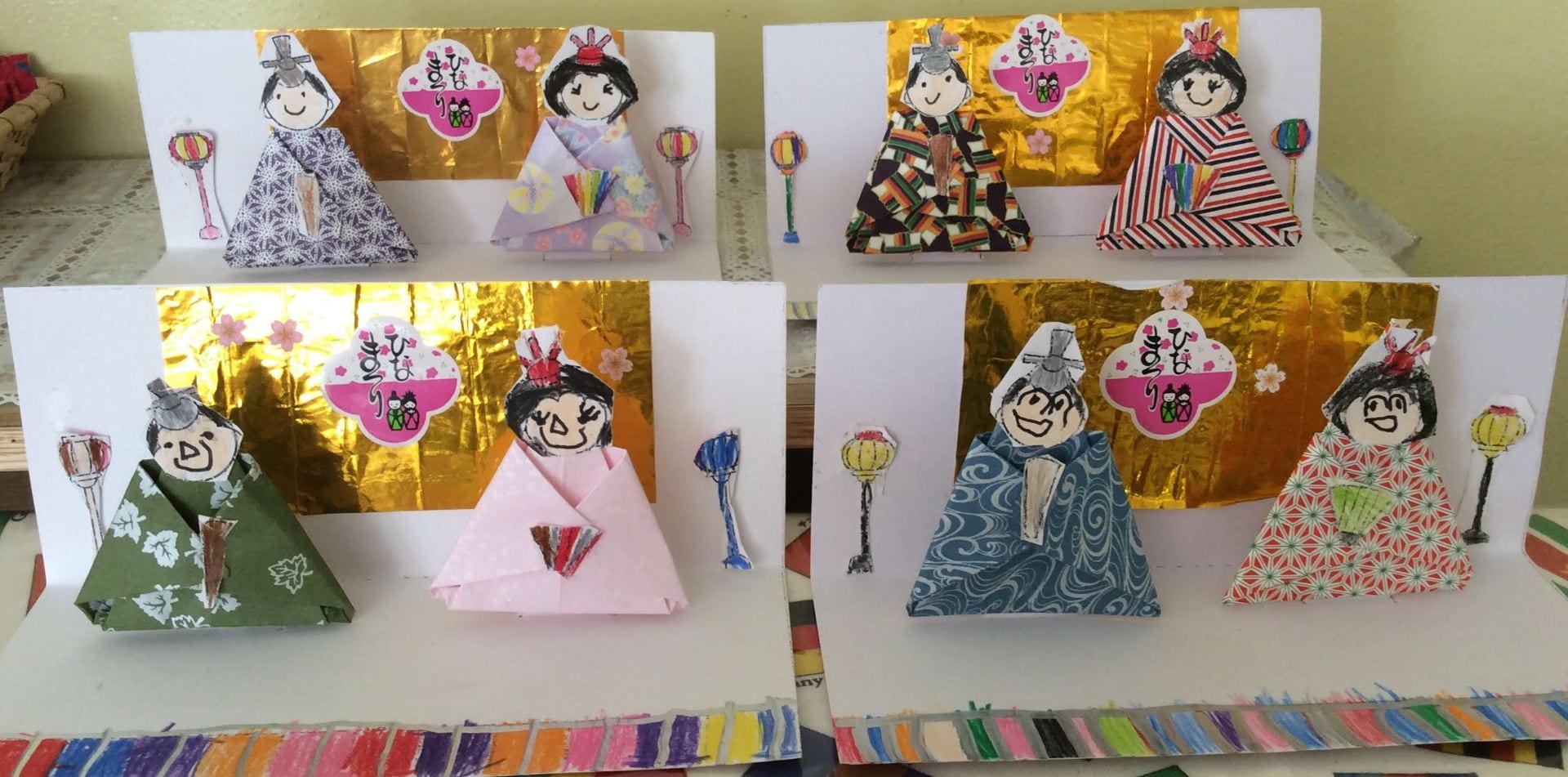 Using origami, a square piece of paper, the children made a kimono folding the square in half, corner to corner, and making the square into a triangle. Use a flat surface to make a nice crease.