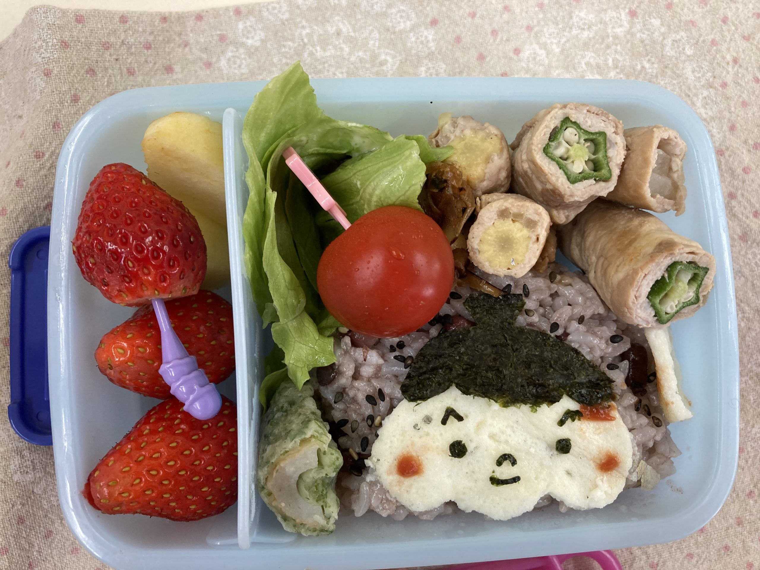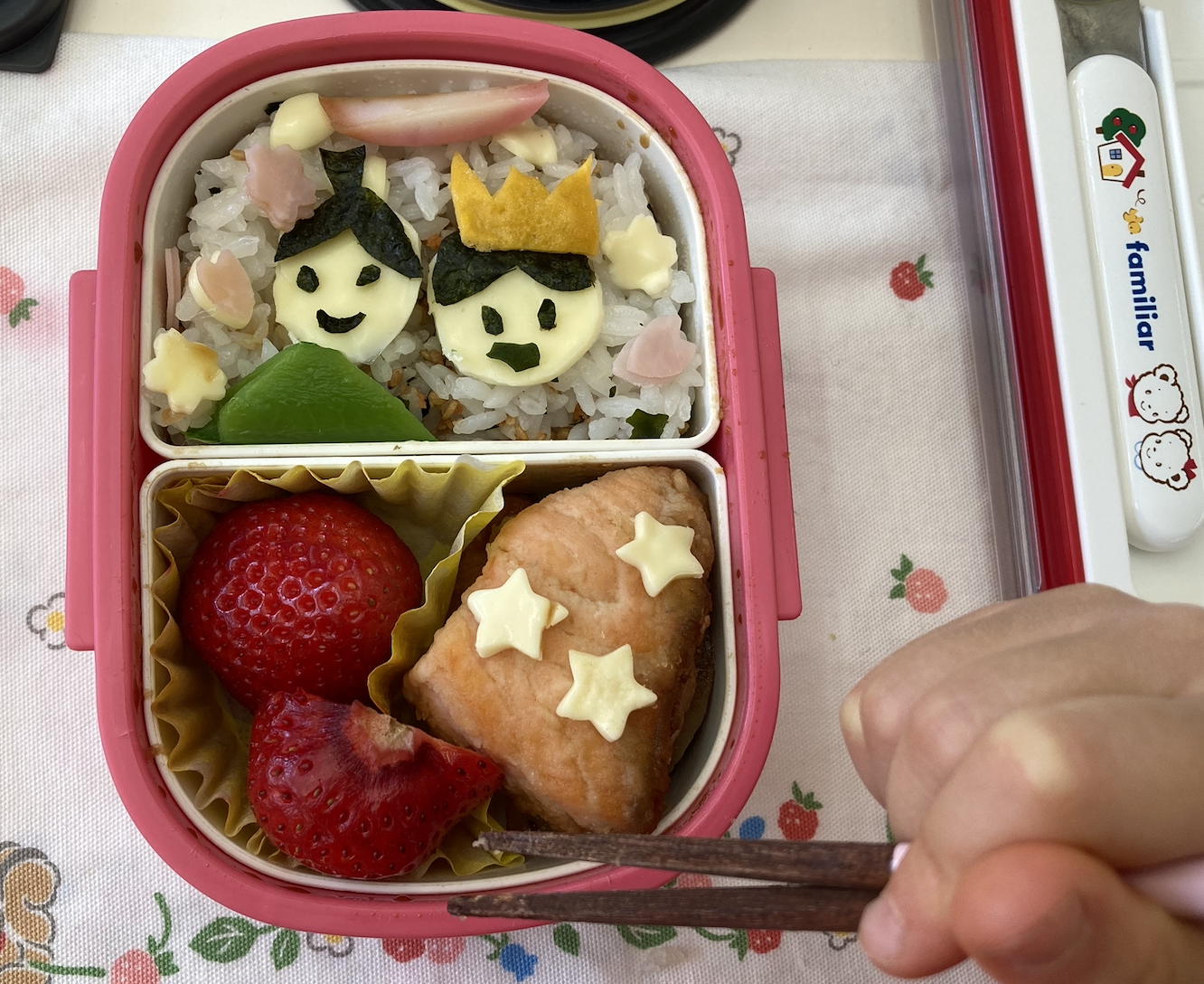 Some cute Japanese obento lunches by creative moms made lunchtime more fun for all. By the way, at lunchtime, we take off our masks, so the children eat in silence as much as possible. And we listen to music while eating.