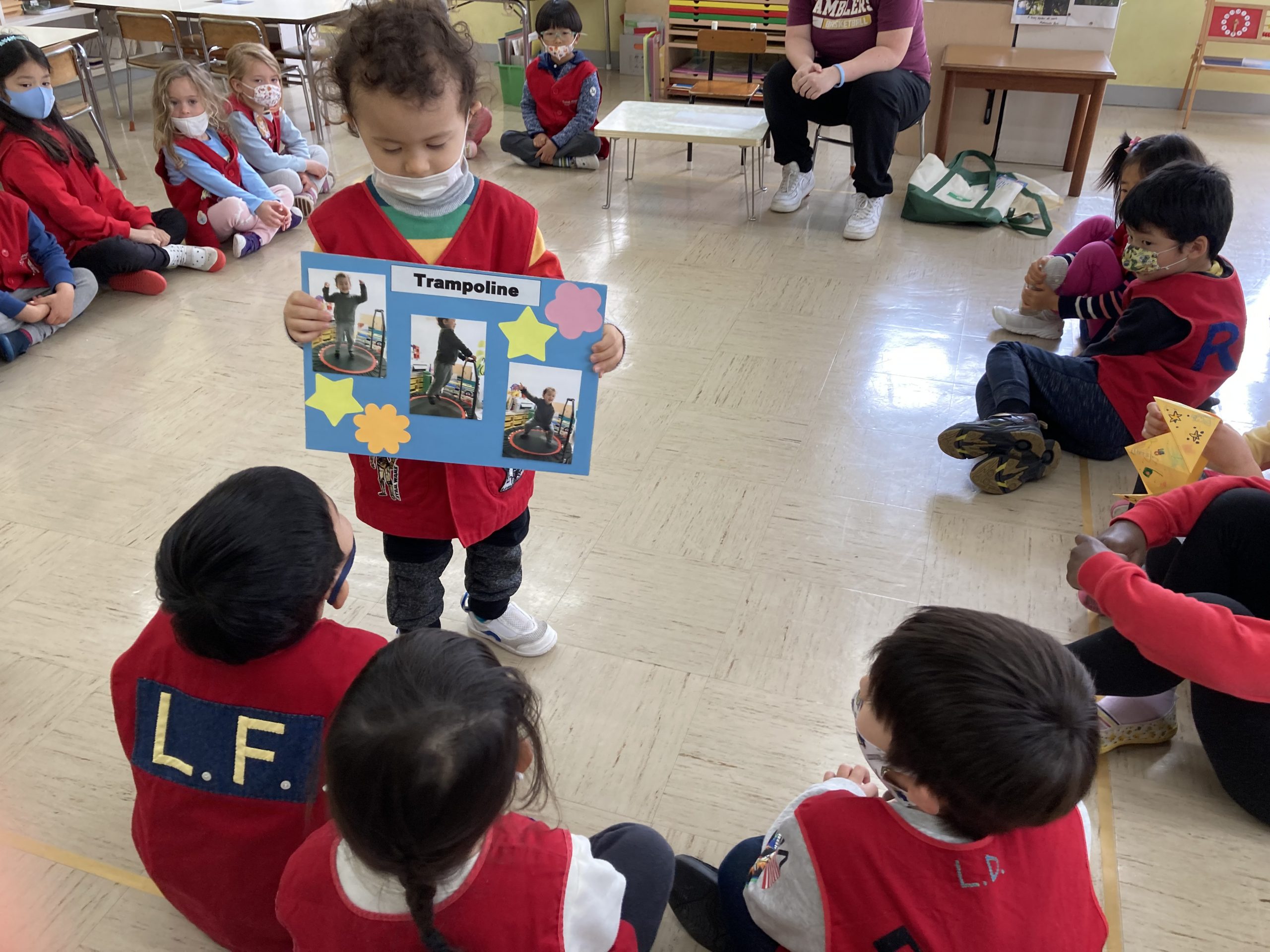 Circle Time: A new child joining Circle Time for the first time.  She started dancing to the music in front of her 18 classmates!  Show and Tell: Things we can’t bring into the classroom, we can still share with photos. “I like jumping on the trampoline.”