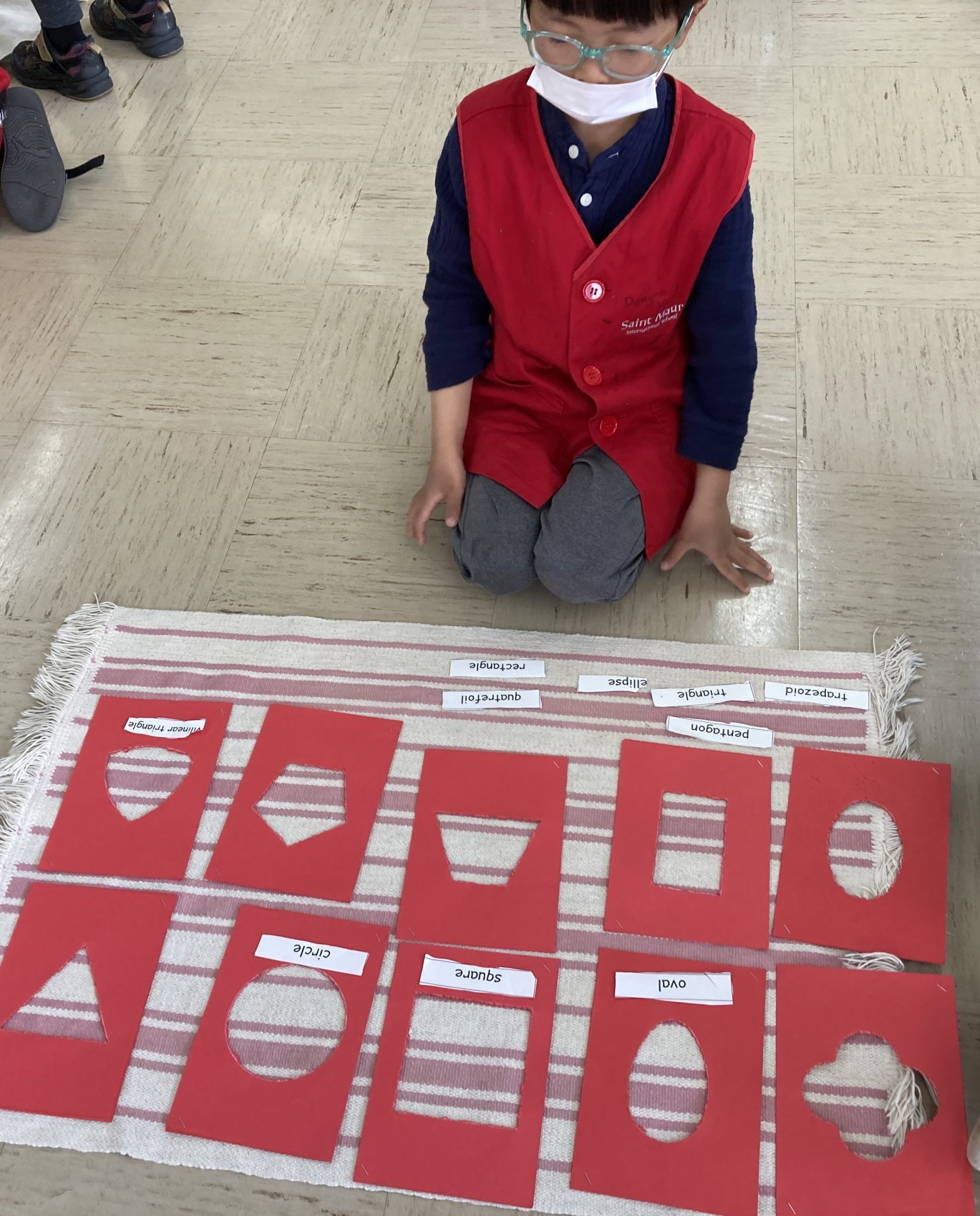 A child found the flag of her home country (Brazil) and her host country (Japan) while having her snack!   Learning the names of 10 shapes.
