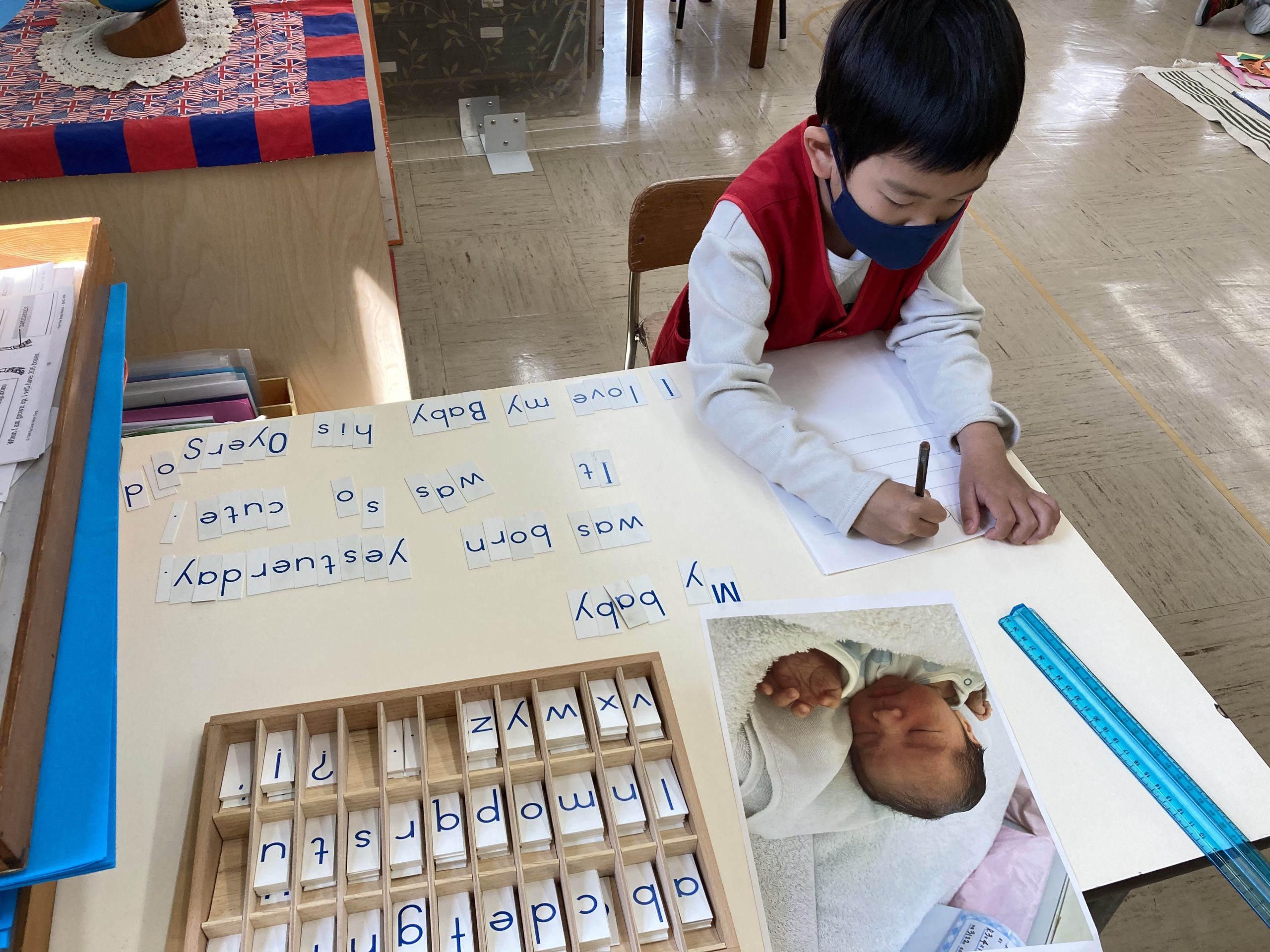 A new addition in the family: Writing a story about his newborn brother using the Small Moveable Alphabet.