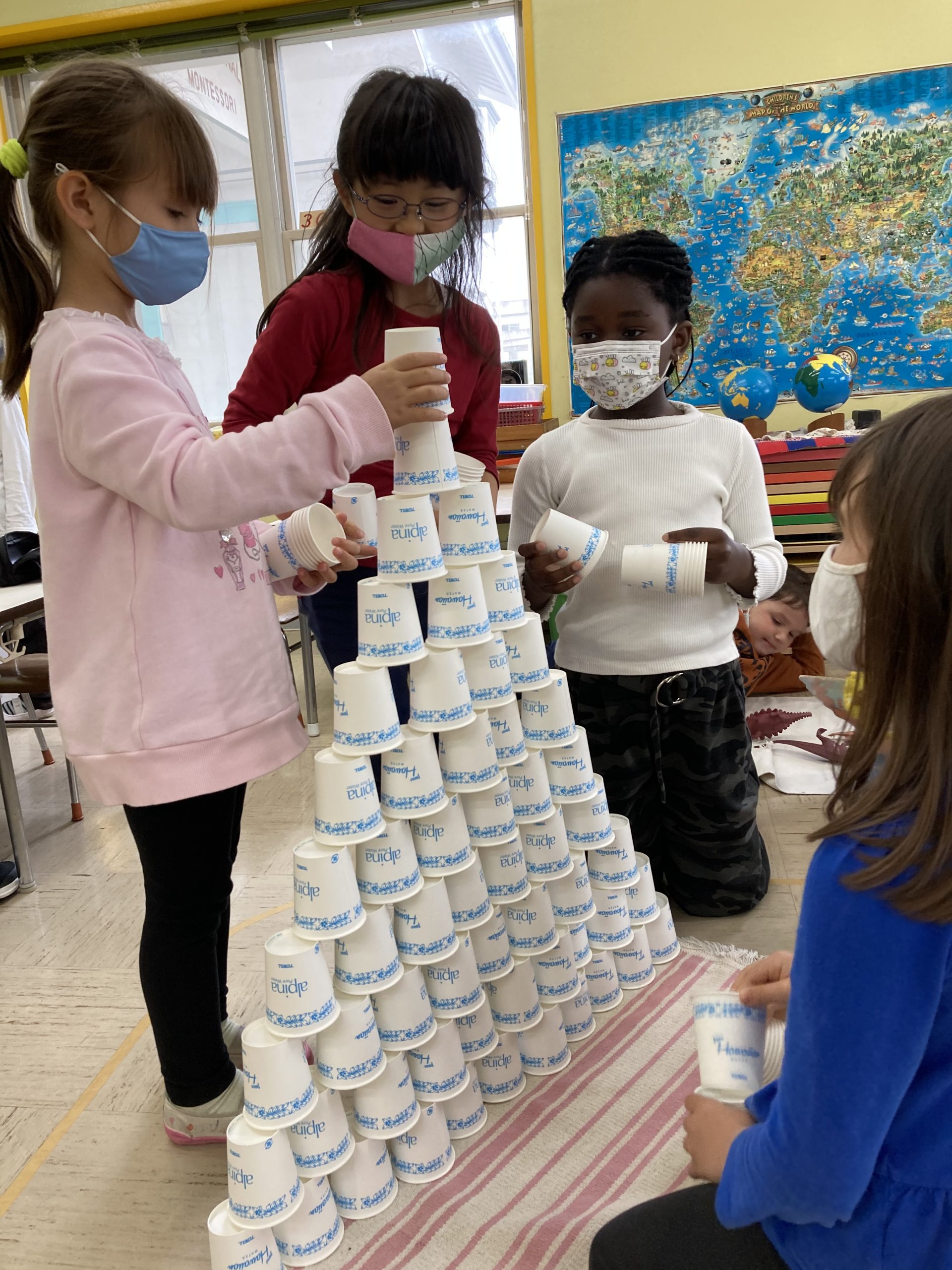 Montessori Fun Day, April 29th: The children went to the interim gym for the last time before the new gym opens, and they had fun tossing in the air and catching the large balloons.   In the classroom: The children wanted to see what they could do with 100 paper cups. “Look what we made together!”