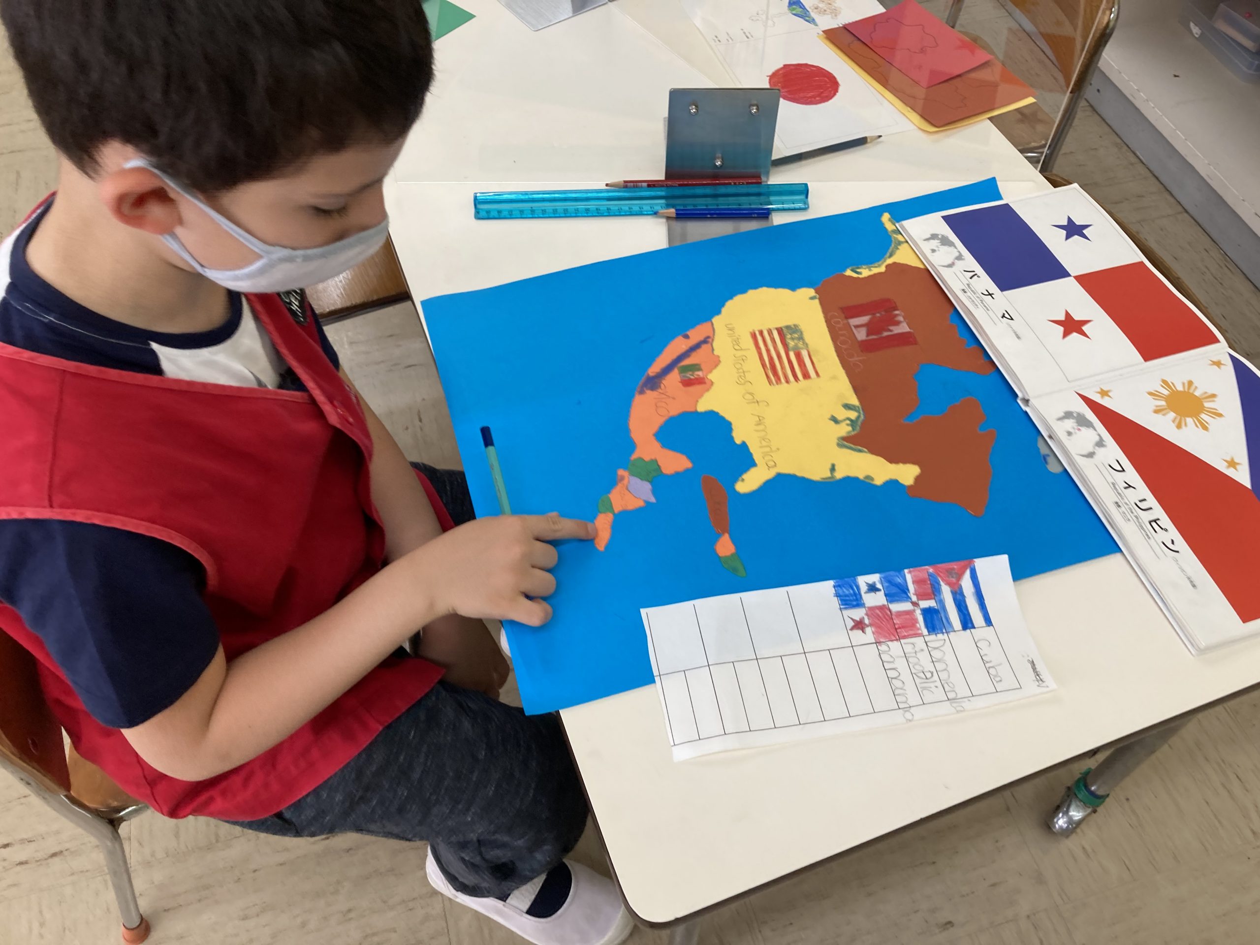 The continent of North America: Discovering the national flag after outlining the country with a pushpin, and pasting the parts together. The children did research along the way.