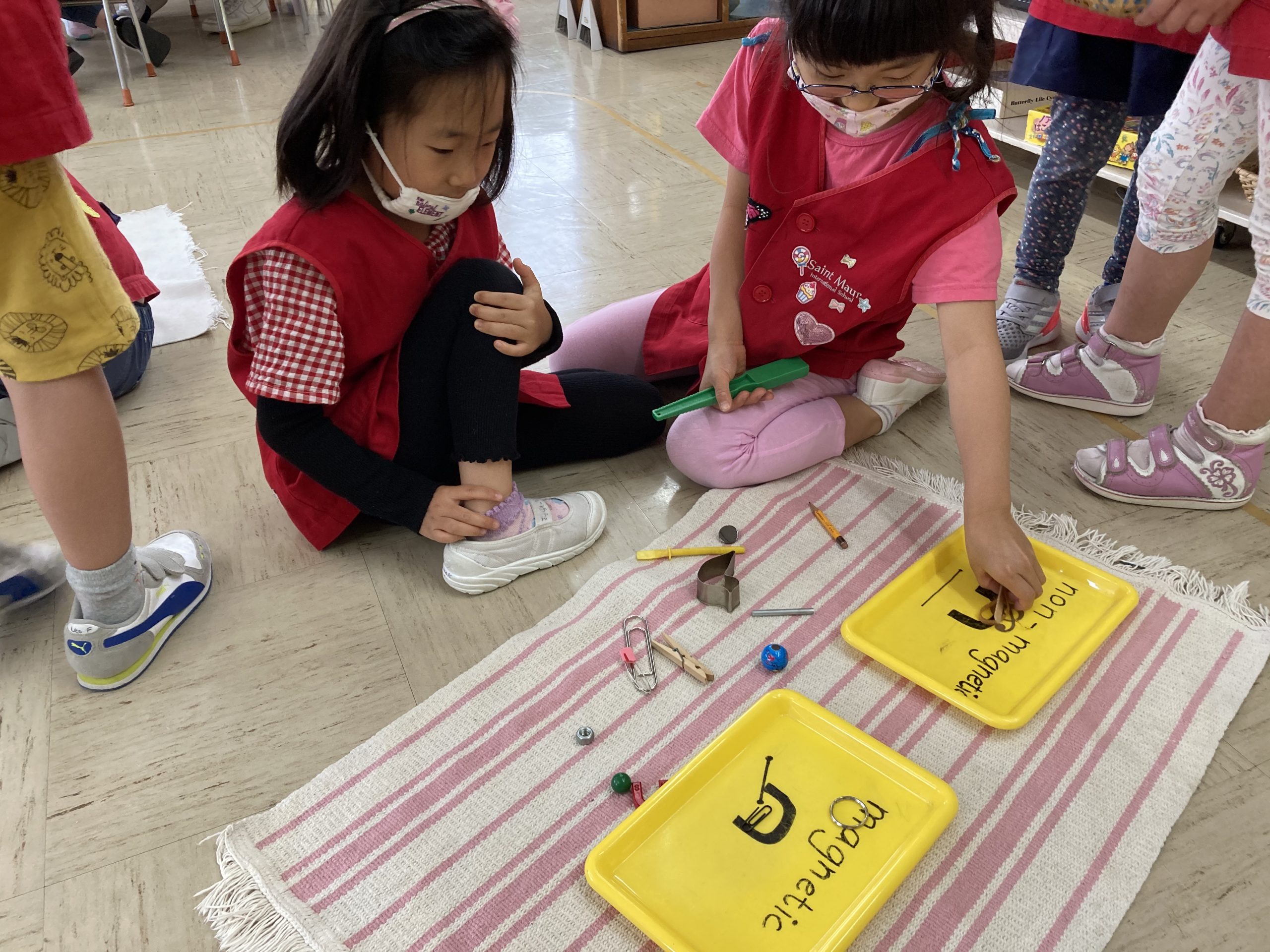 Science experiment: Magnetic and non-magnetic. The children first had to guess if an item was magnetic or non-magnetic, and then they experimented to see if their hypothesis was correct or not by moving the magnets closer. They took turns with a partner.