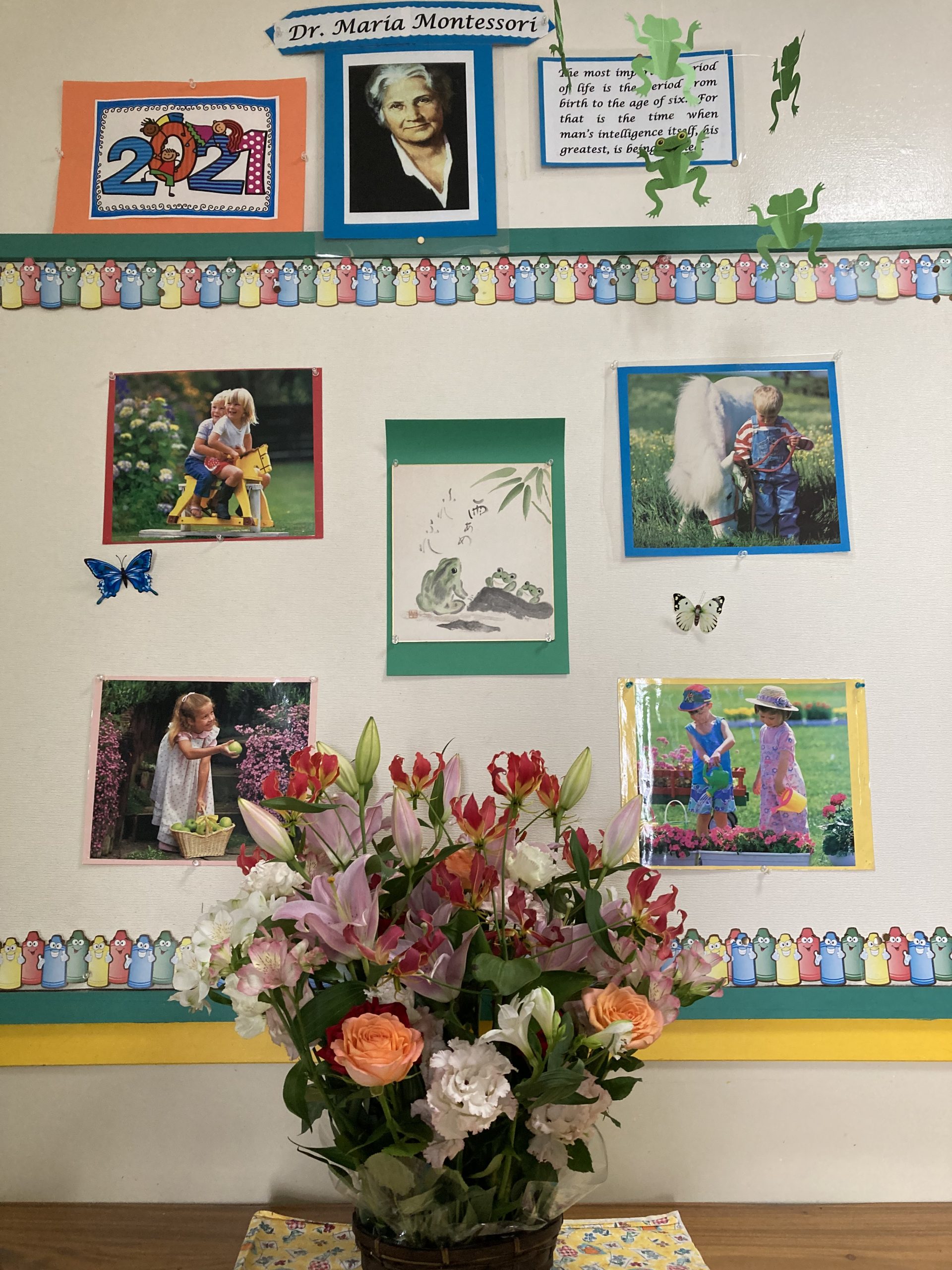 Standing behind the gorgeous basket of flowers from all of our children’s families, the Montessori team of the 2020-21 school year would like to say “Thank you for the fun times we had together with the children and parents this academic year in the classroom on campus.” It was a real coordinated effort, which also included school staff in the Library and PE, as well as AV / Lighting crew for the Fine Arts Auditorium. Continue to stay safe and well, and have a restful summer vacation. We took off our masks for a quick photo to smile at the camera on the last faculty work week. Please stay cool, and wear your masks whenever outside to stay healthy during the hot summer!