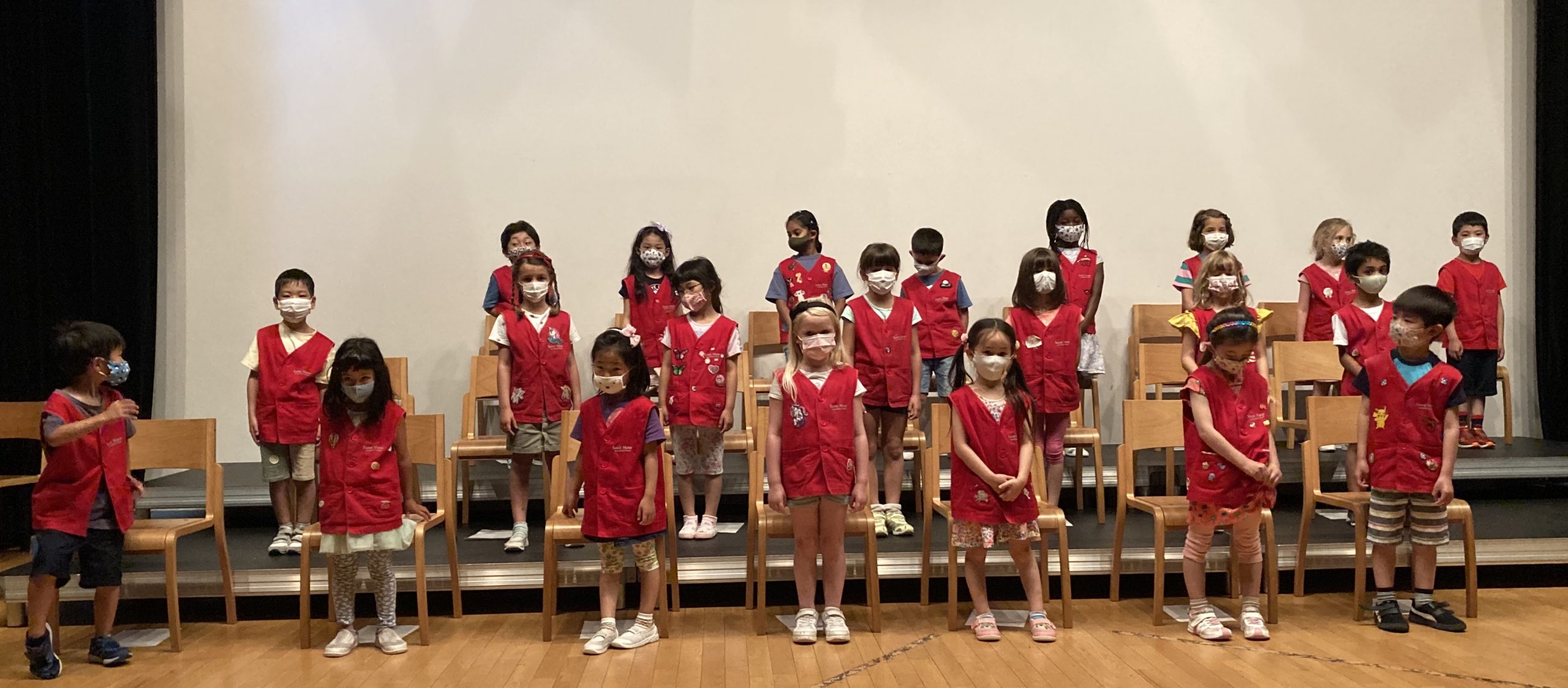 Monday, June 7th, was the Completion Ceremony for our 22 Montessori graduates from the three Montessori classes. We could hold the ceremony in the Fine Arts Auditorium, with each graduate limited to inviting three members of the same household—due to Covid-19 preventative measures recommended. We had a few practices earlier in the Auditorium with the children, and then the actual day arrived. We started with a prayer thanking God for this special day.