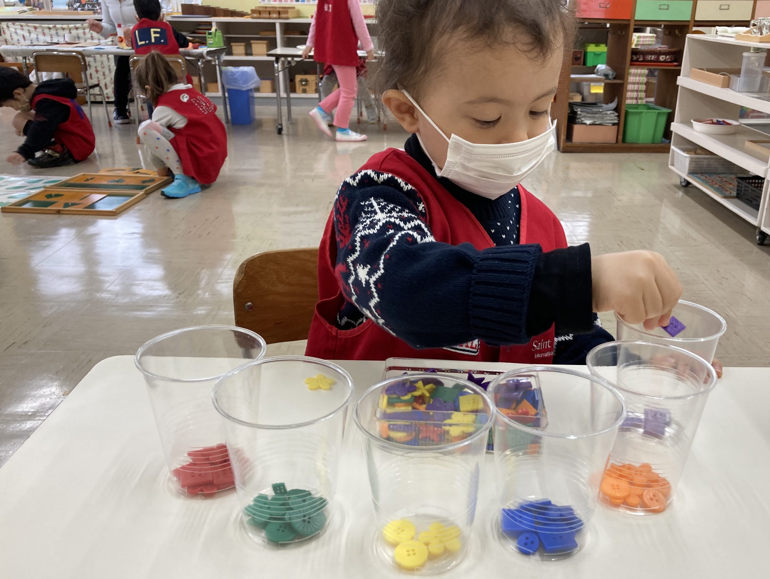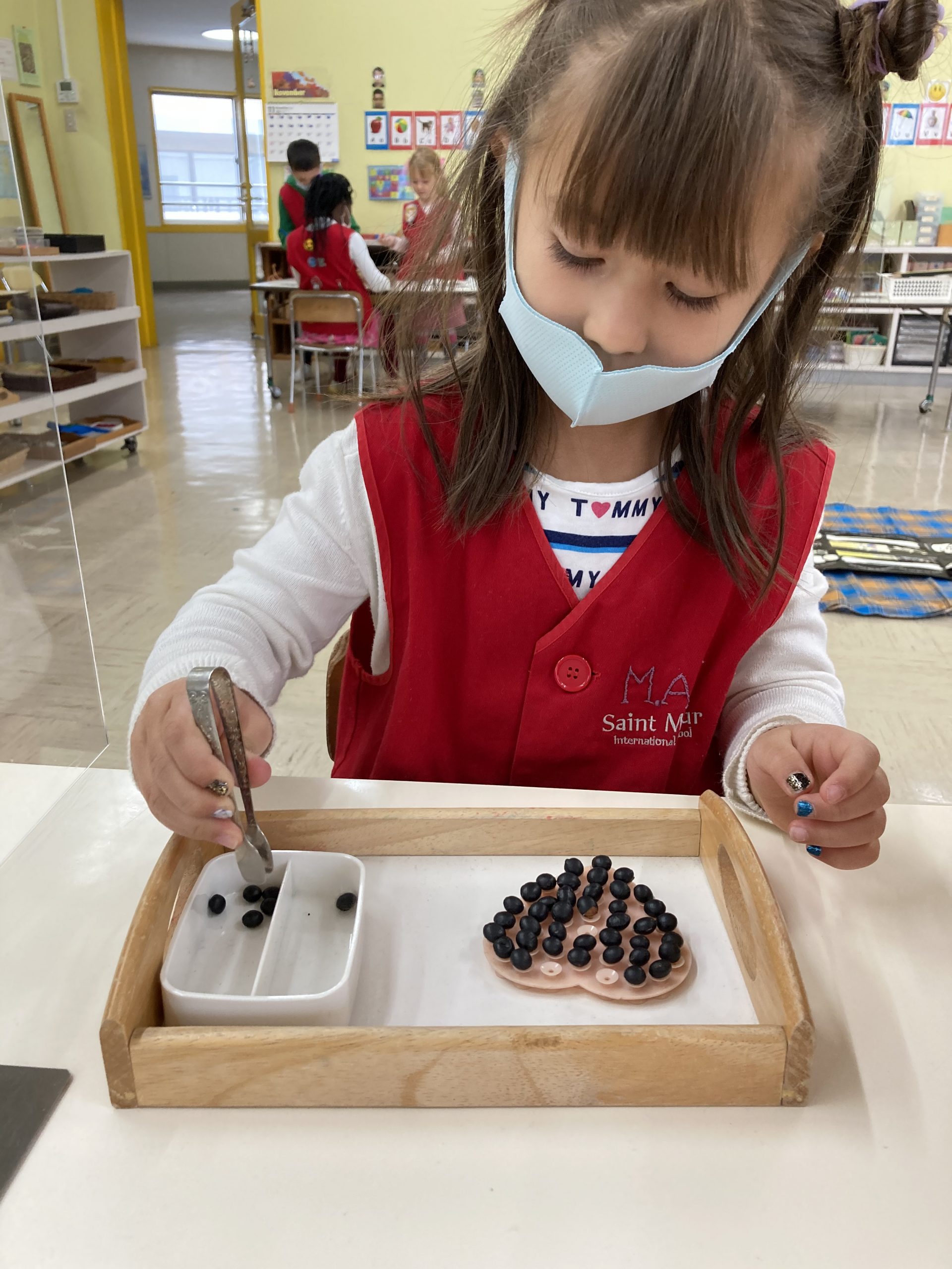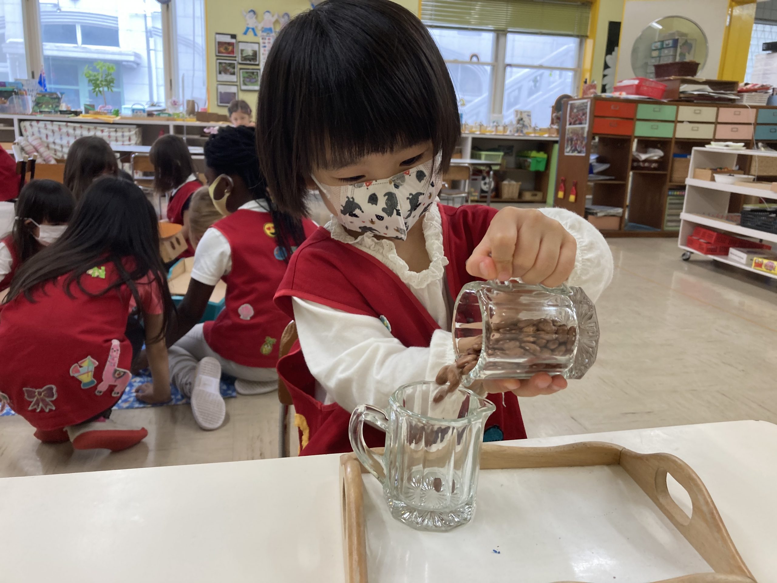 What did we learn over the last few weeks? Let’s see our classroom in action. A three-year-old carefully pouring beans from one jug to another, a part of Practical Life activity. Concentration and eye-hand coordination are developed.