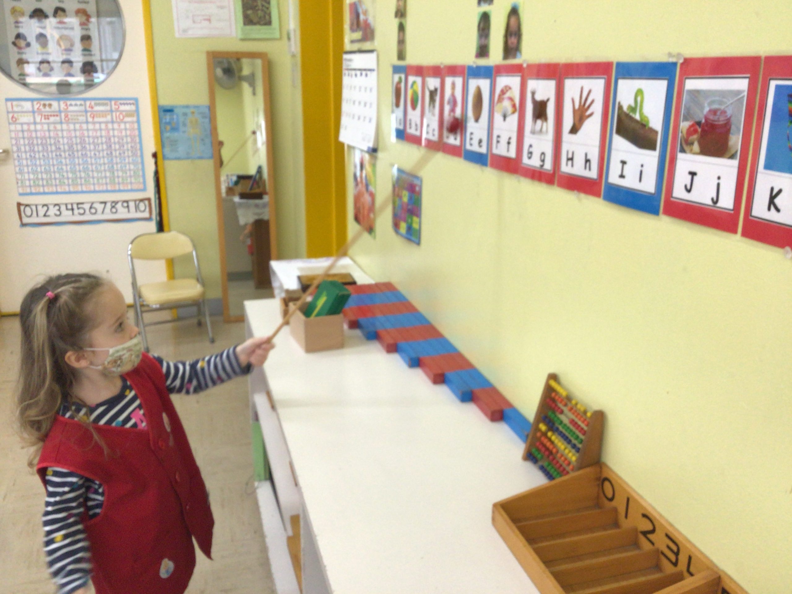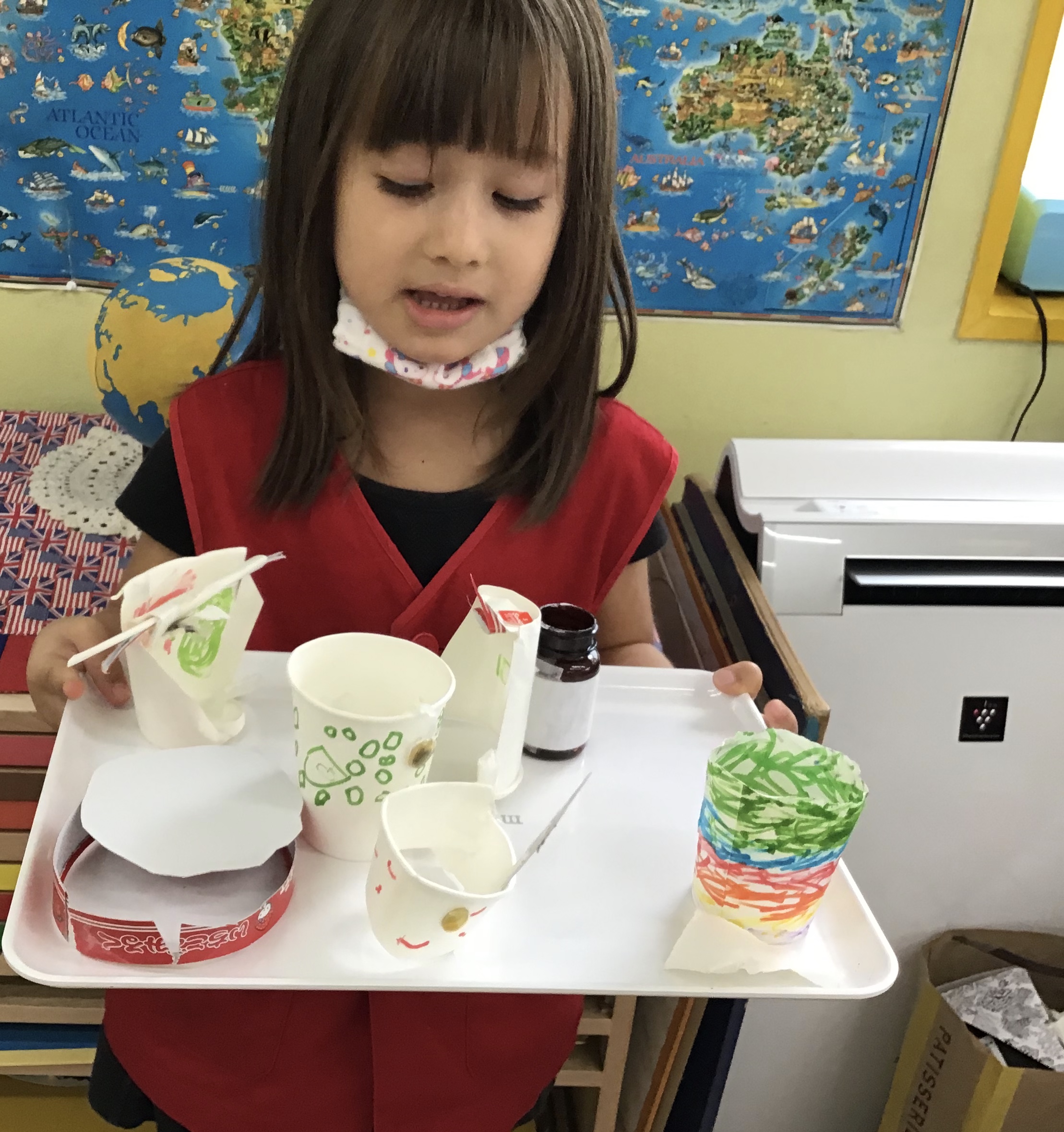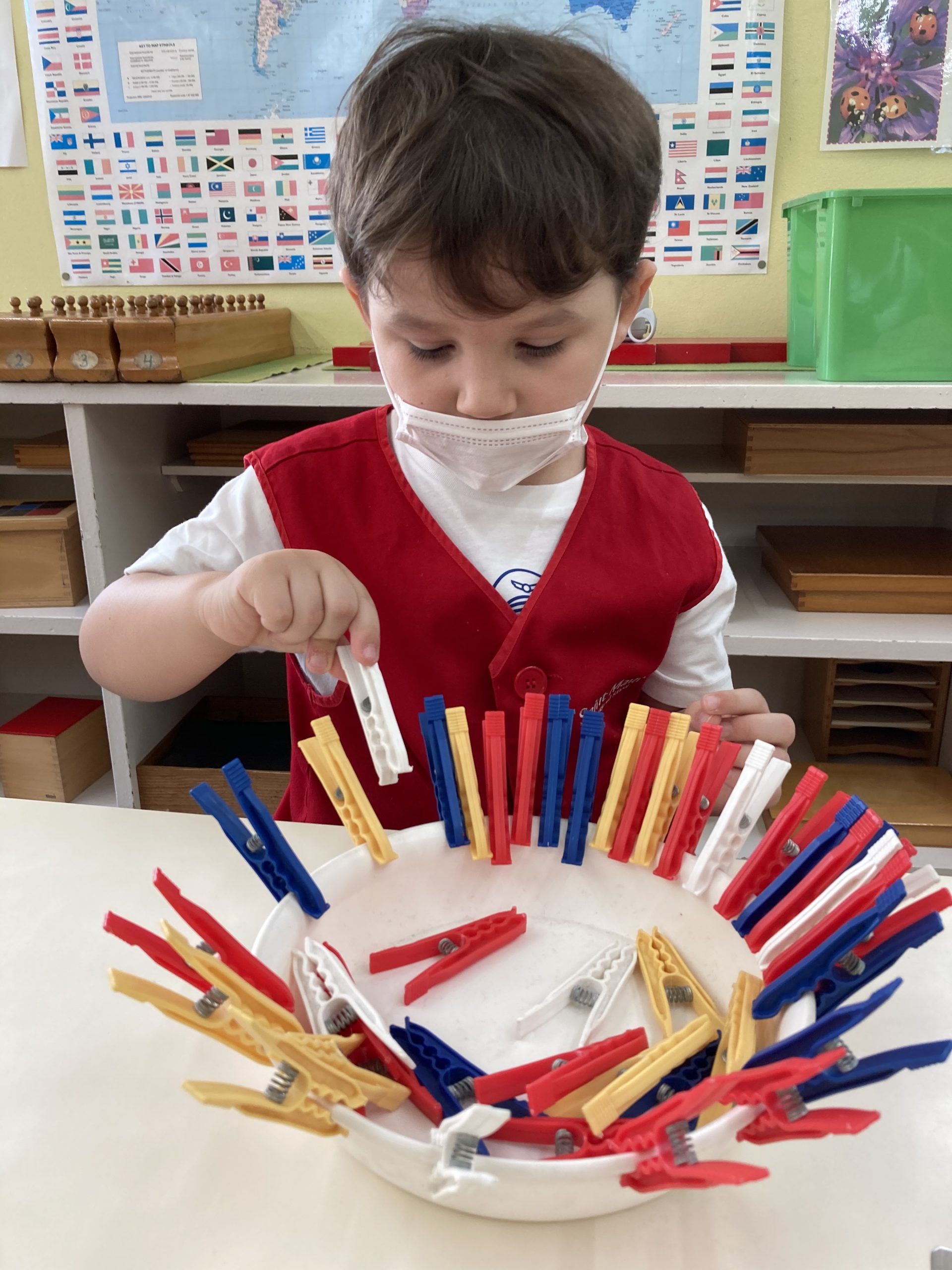 What did we learn over the last few weeks? Let’s see our classroom in action. A three-year-old carefully pouring beans from one jug to another, a part of Practical Life activity. Concentration and eye-hand coordination are developed.