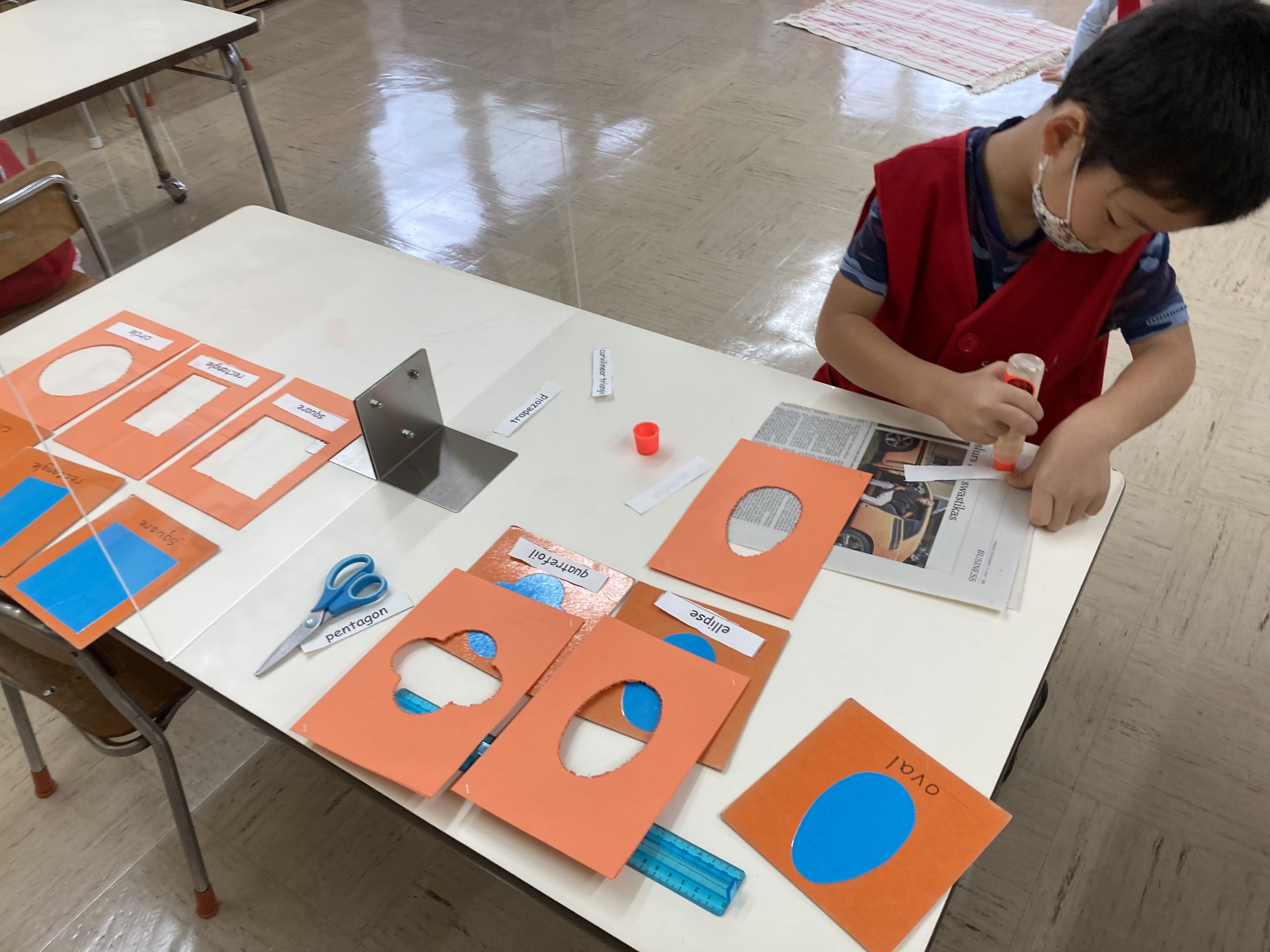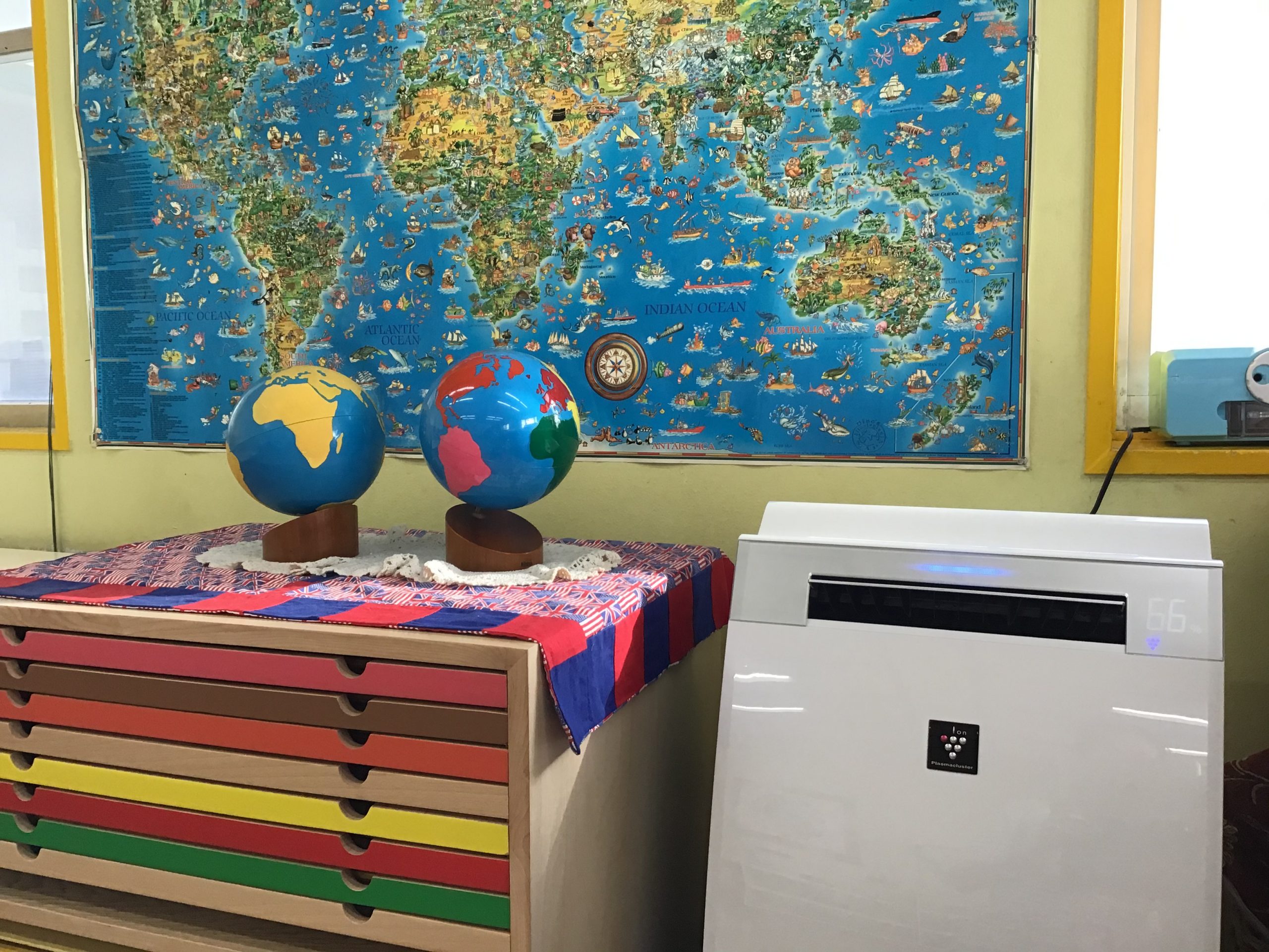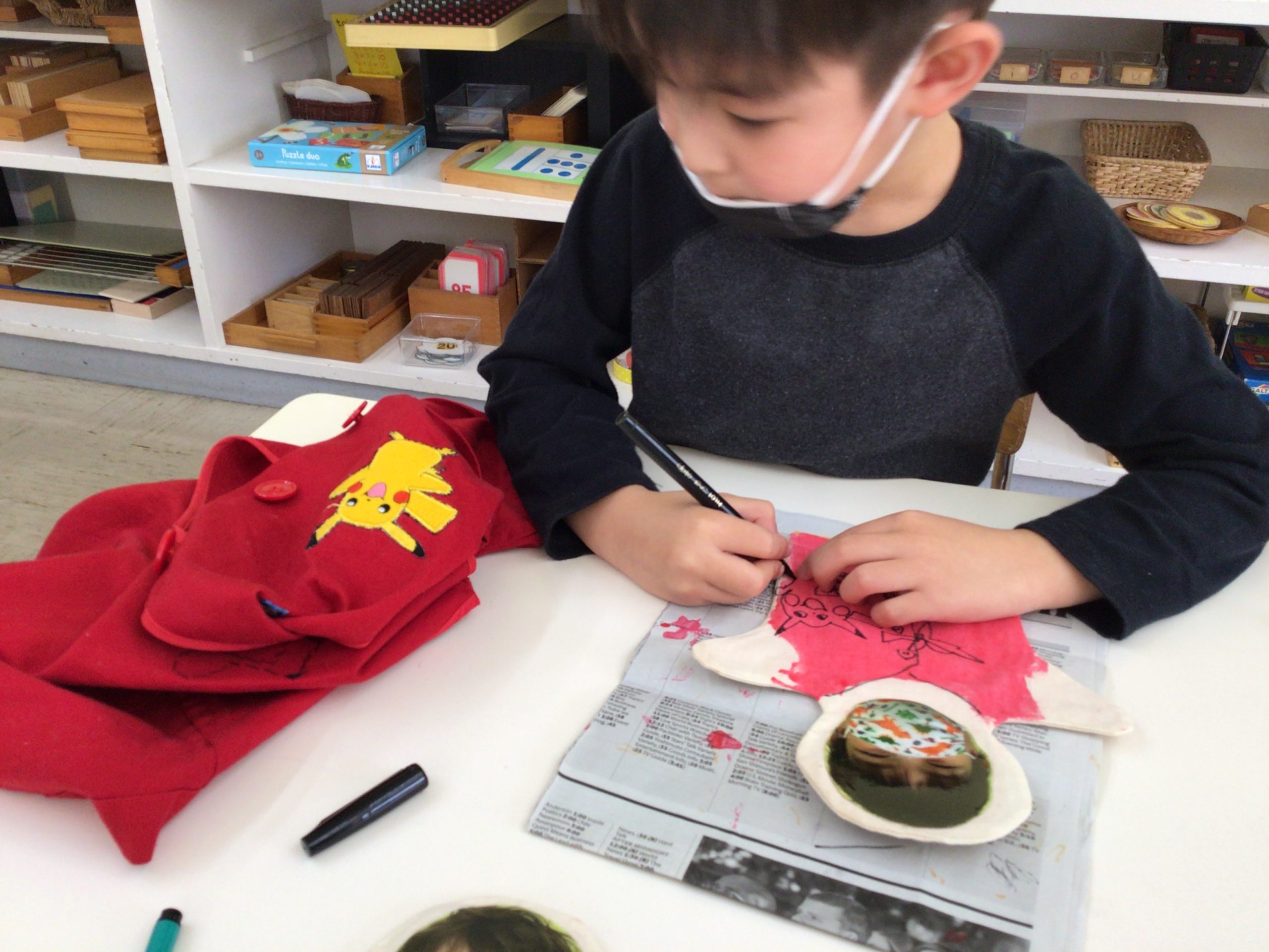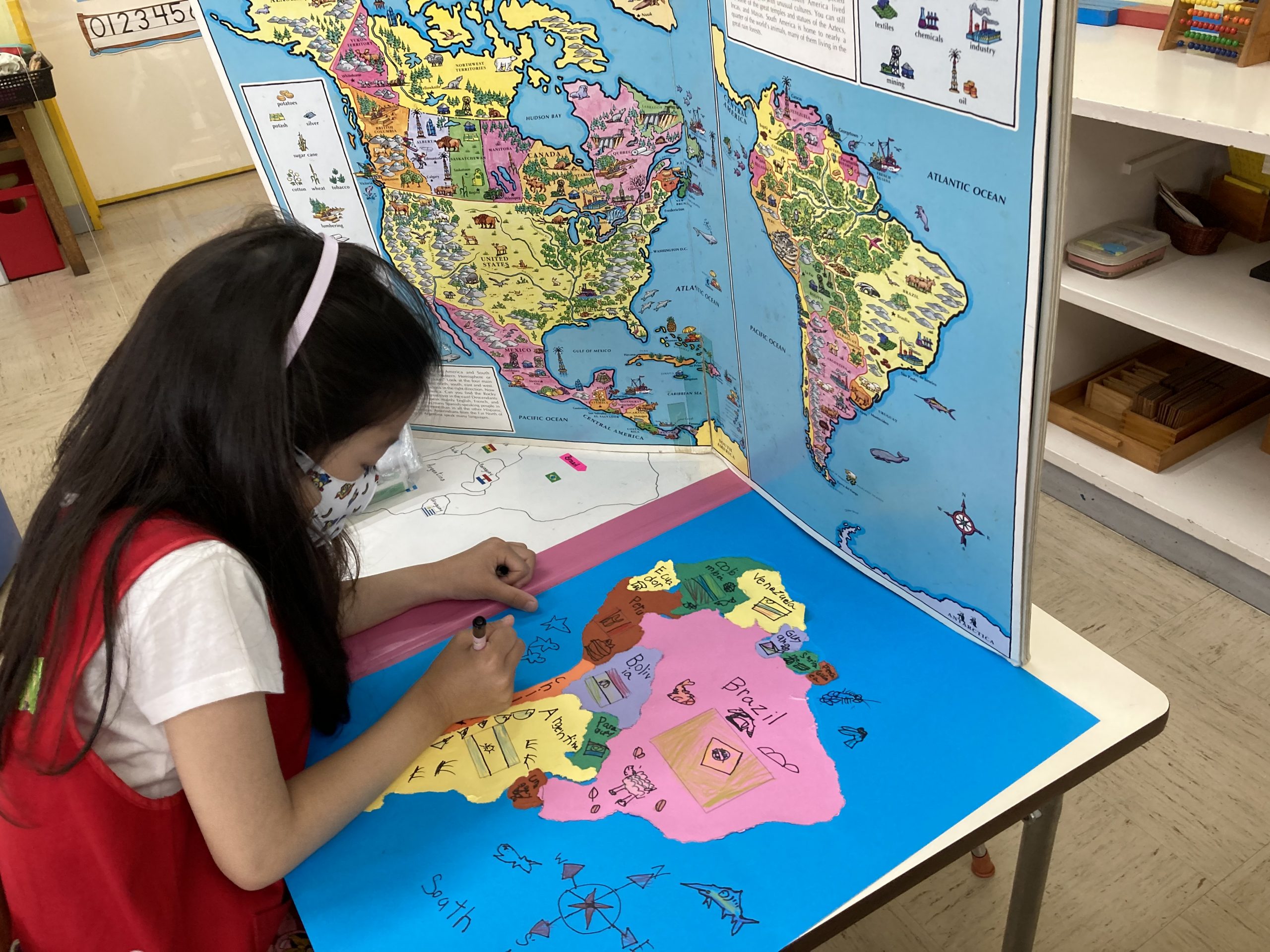 Map-making, a popular activity in a Montessori classroom. Making a continent globe, learning key facts as they pinned the outlines.