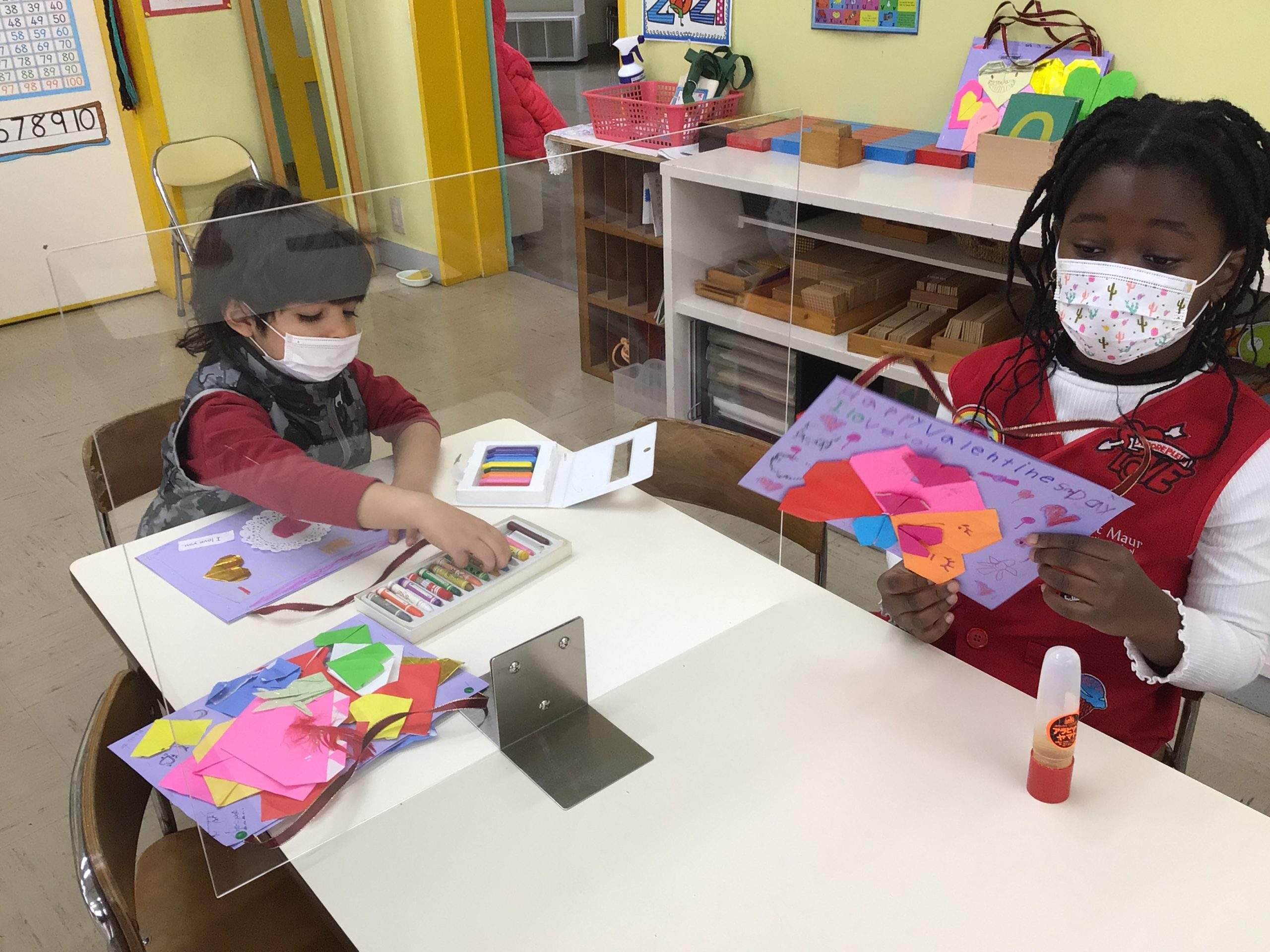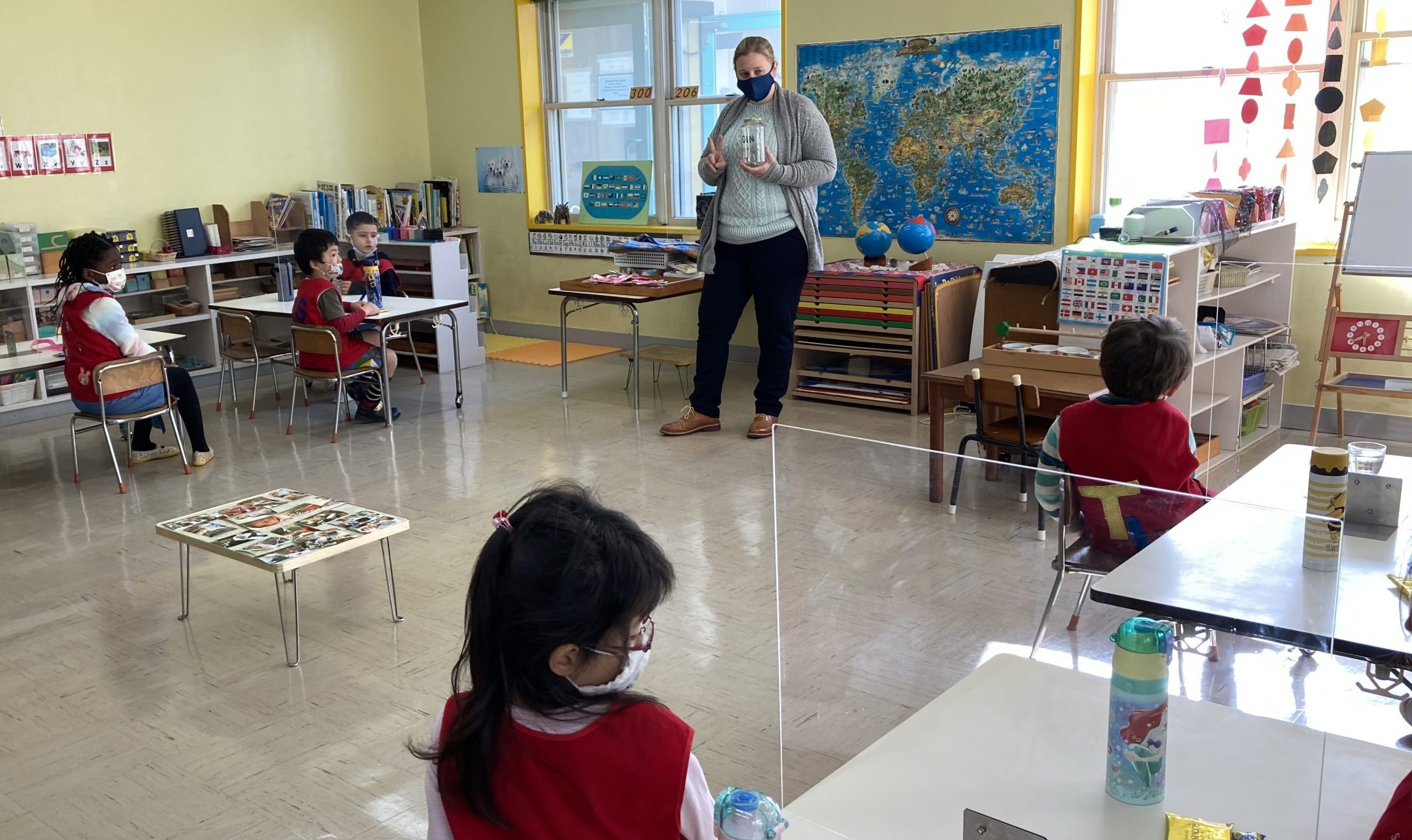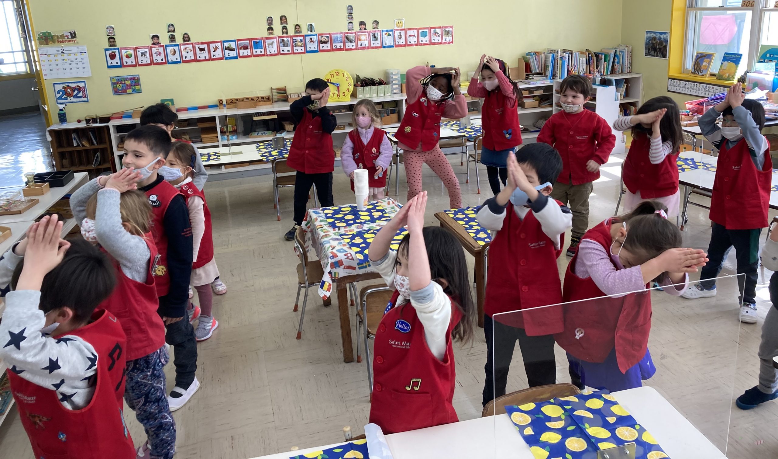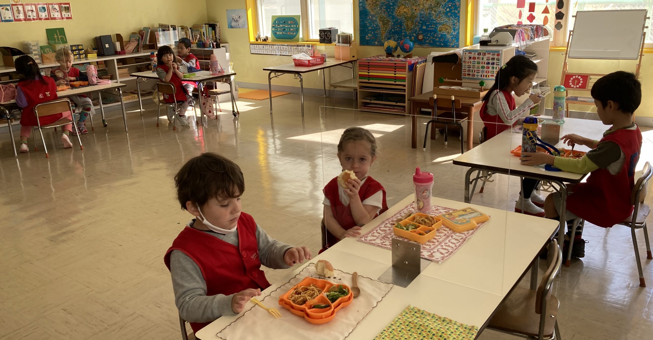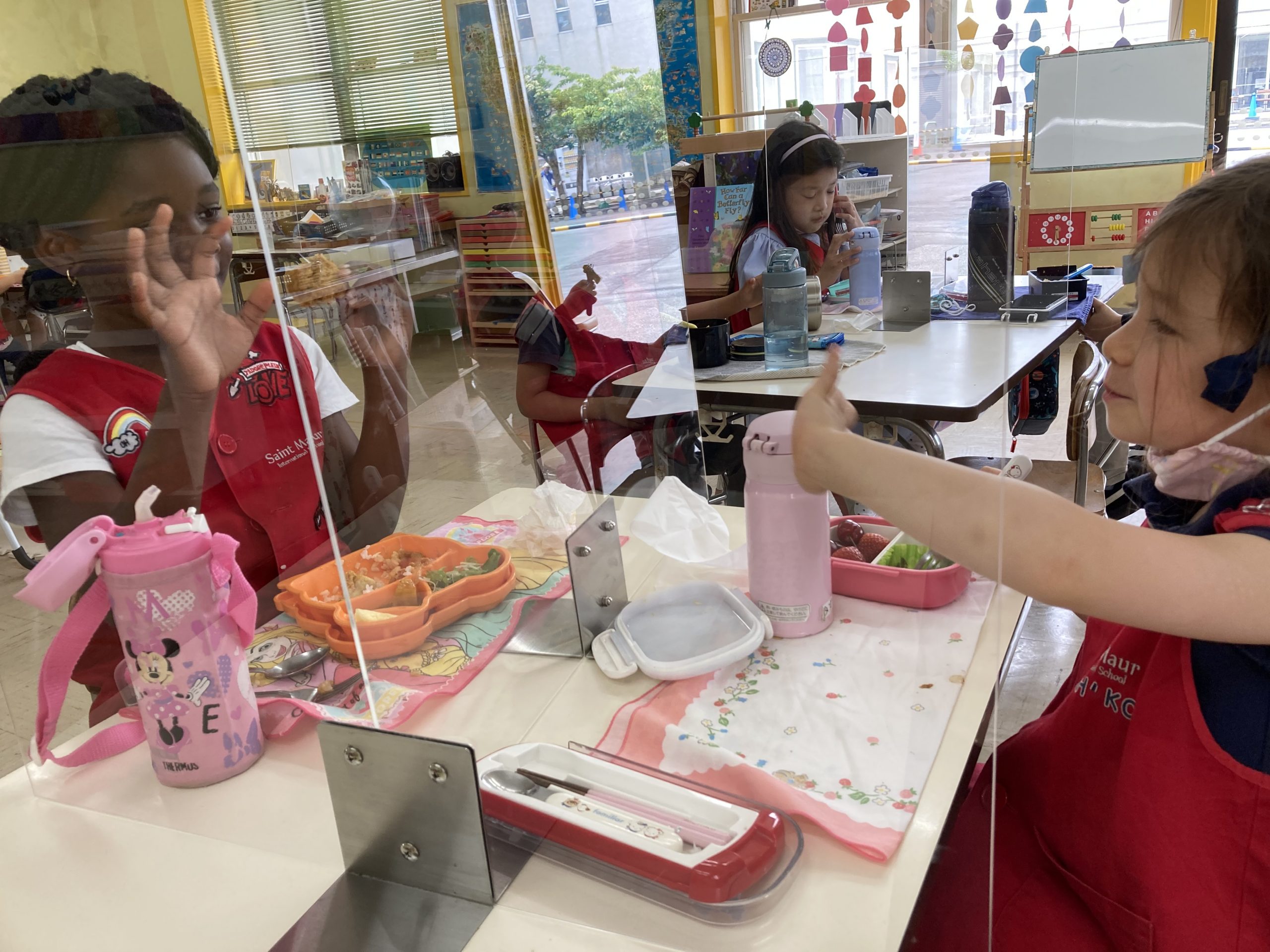 When the children were eating lunch, they knew that they had to eat in silence since they took off their masks. As a result, the children developed their own sign language to communicate with each other through the transparent hard-plastic table dividers. How clever and fun!