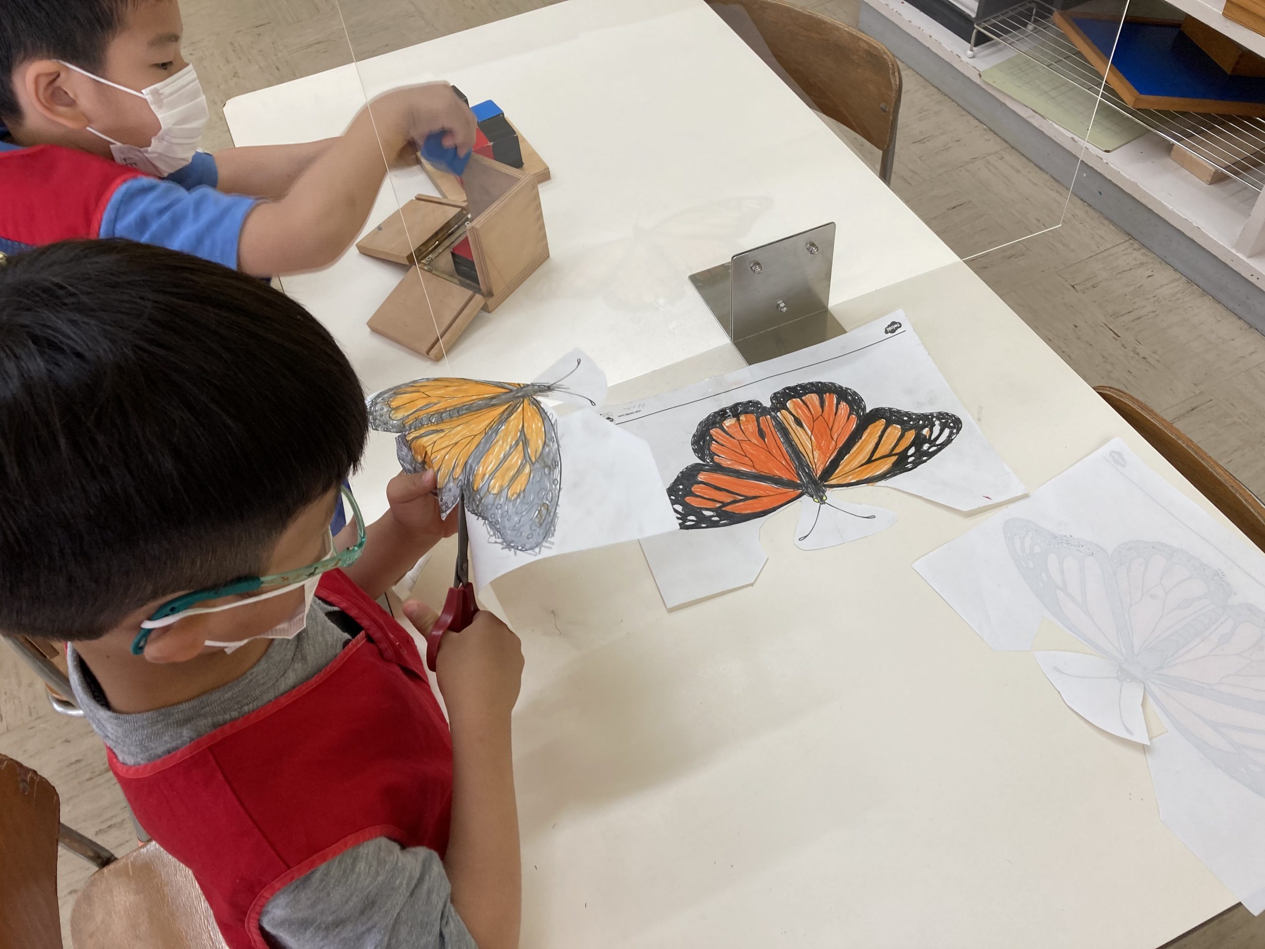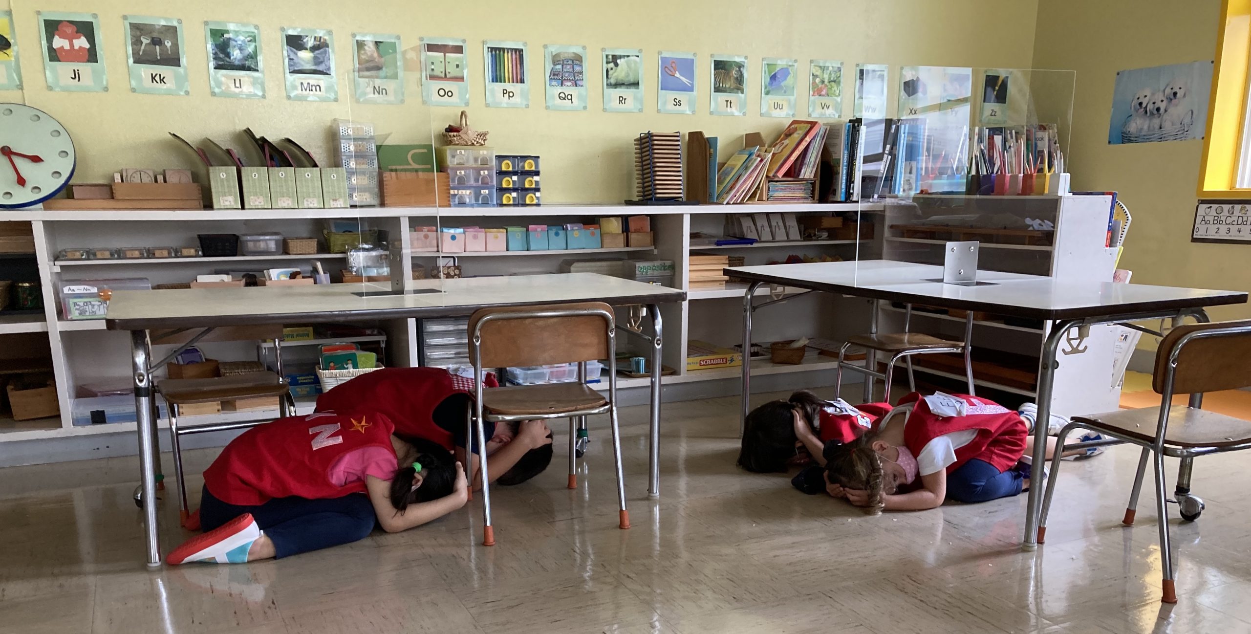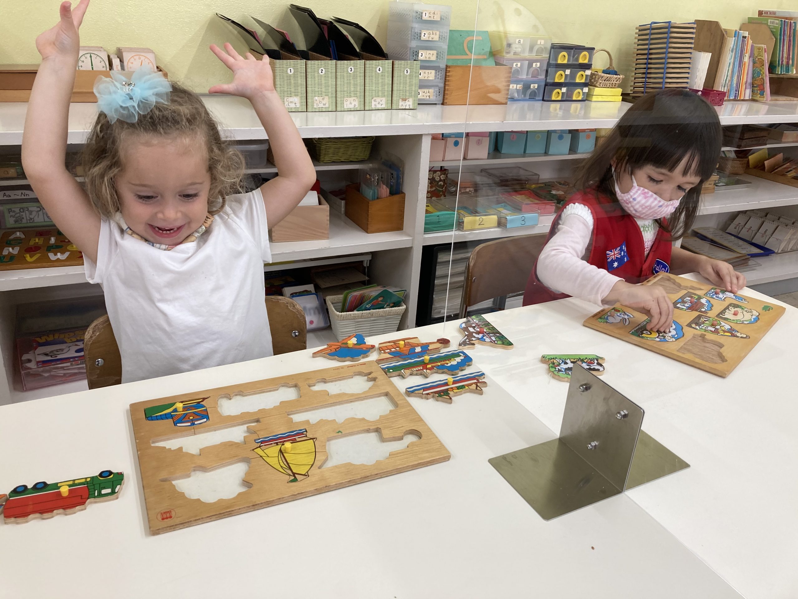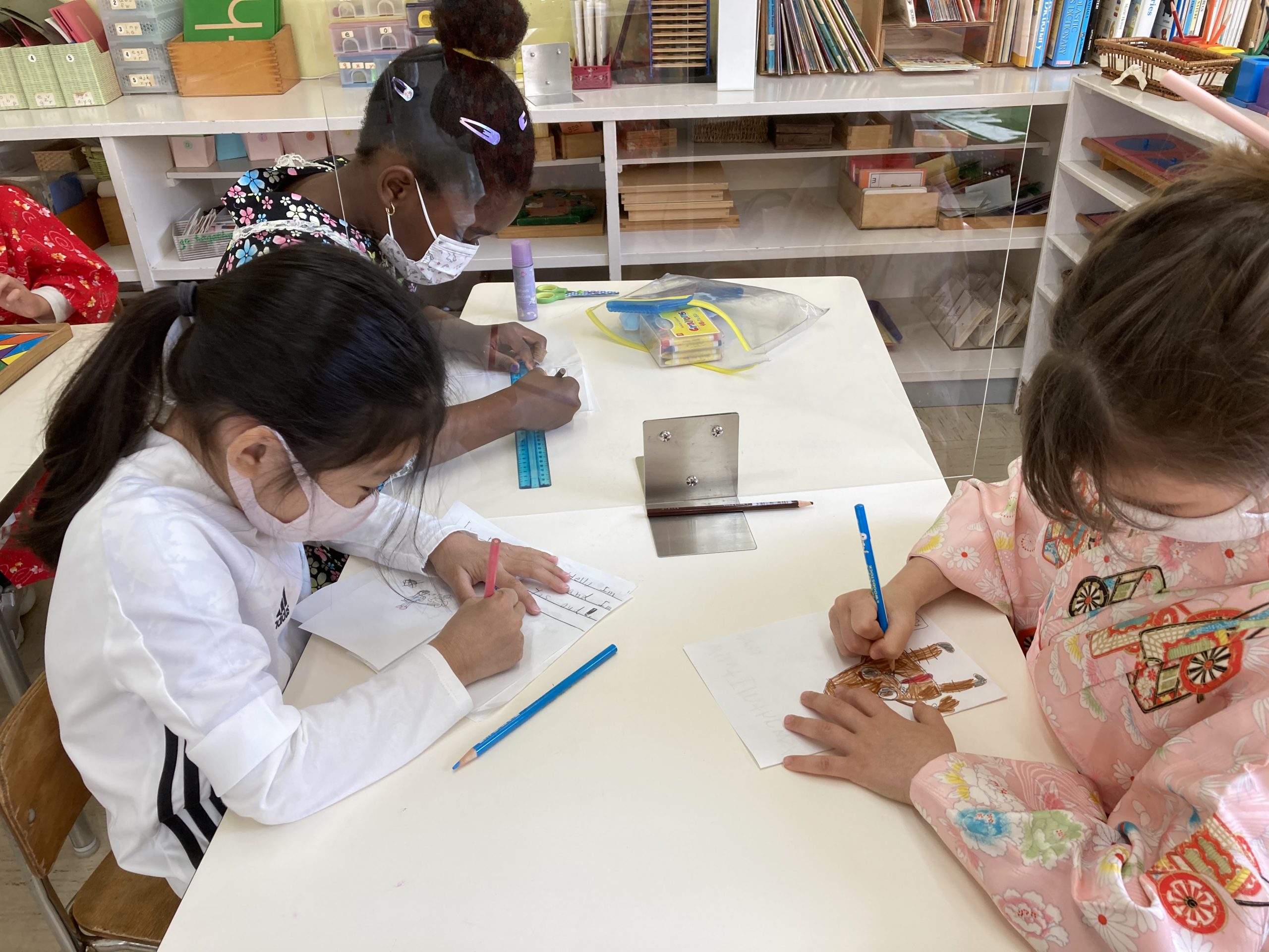 When the children were eating lunch, they knew that they had to eat in silence since they took off their masks. As a result, the children developed their own sign language to communicate with each other through the transparent hard-plastic table dividers. How clever and fun!