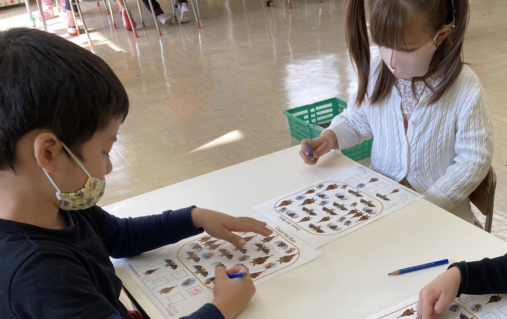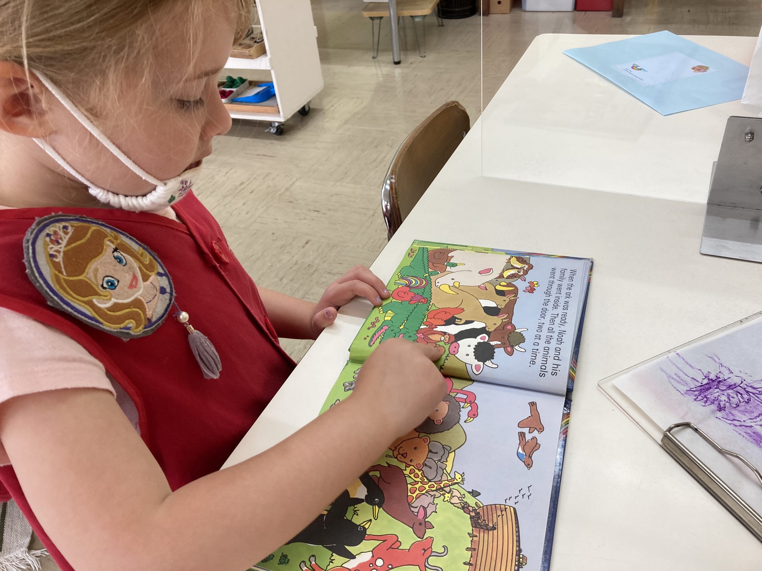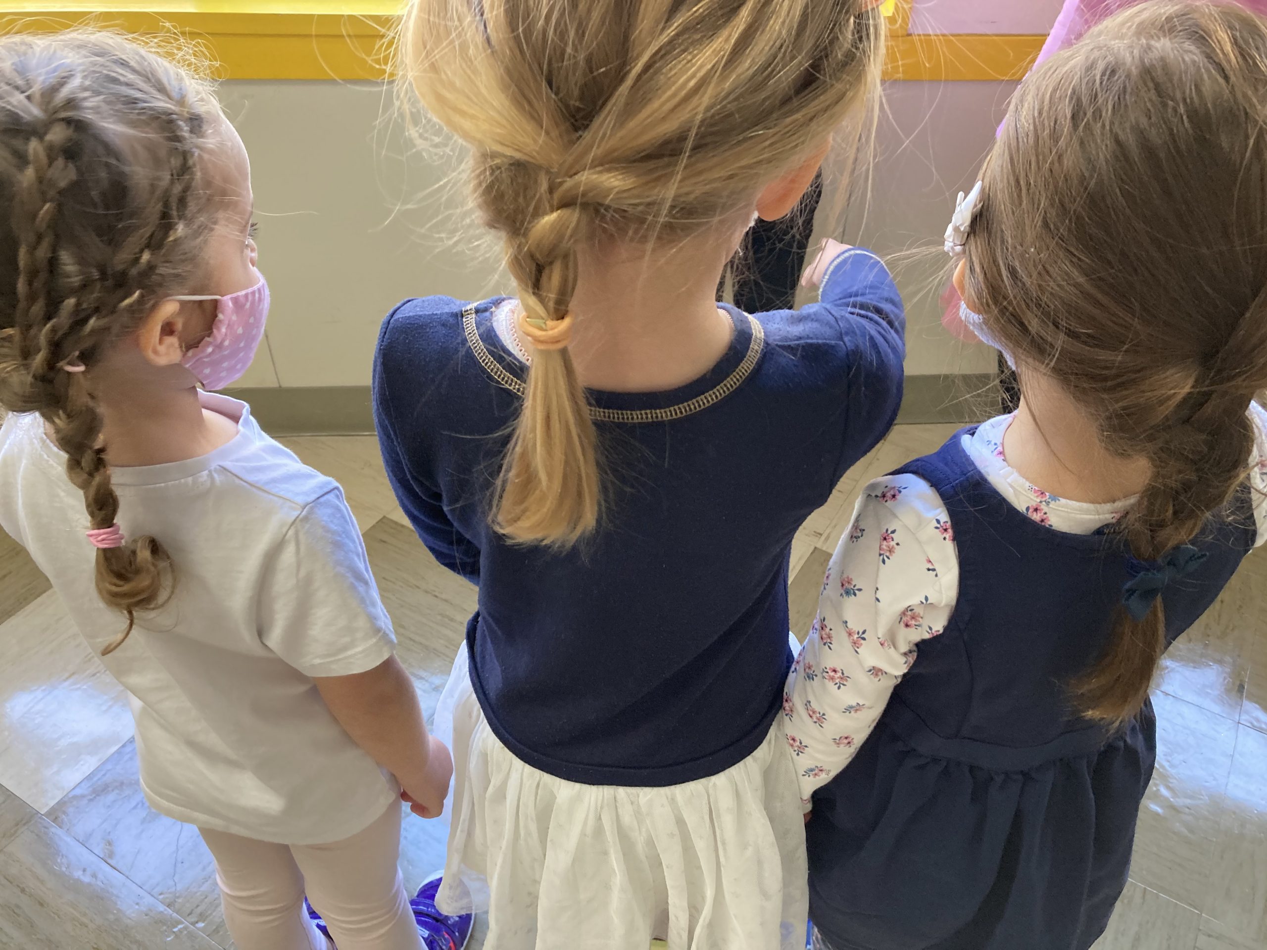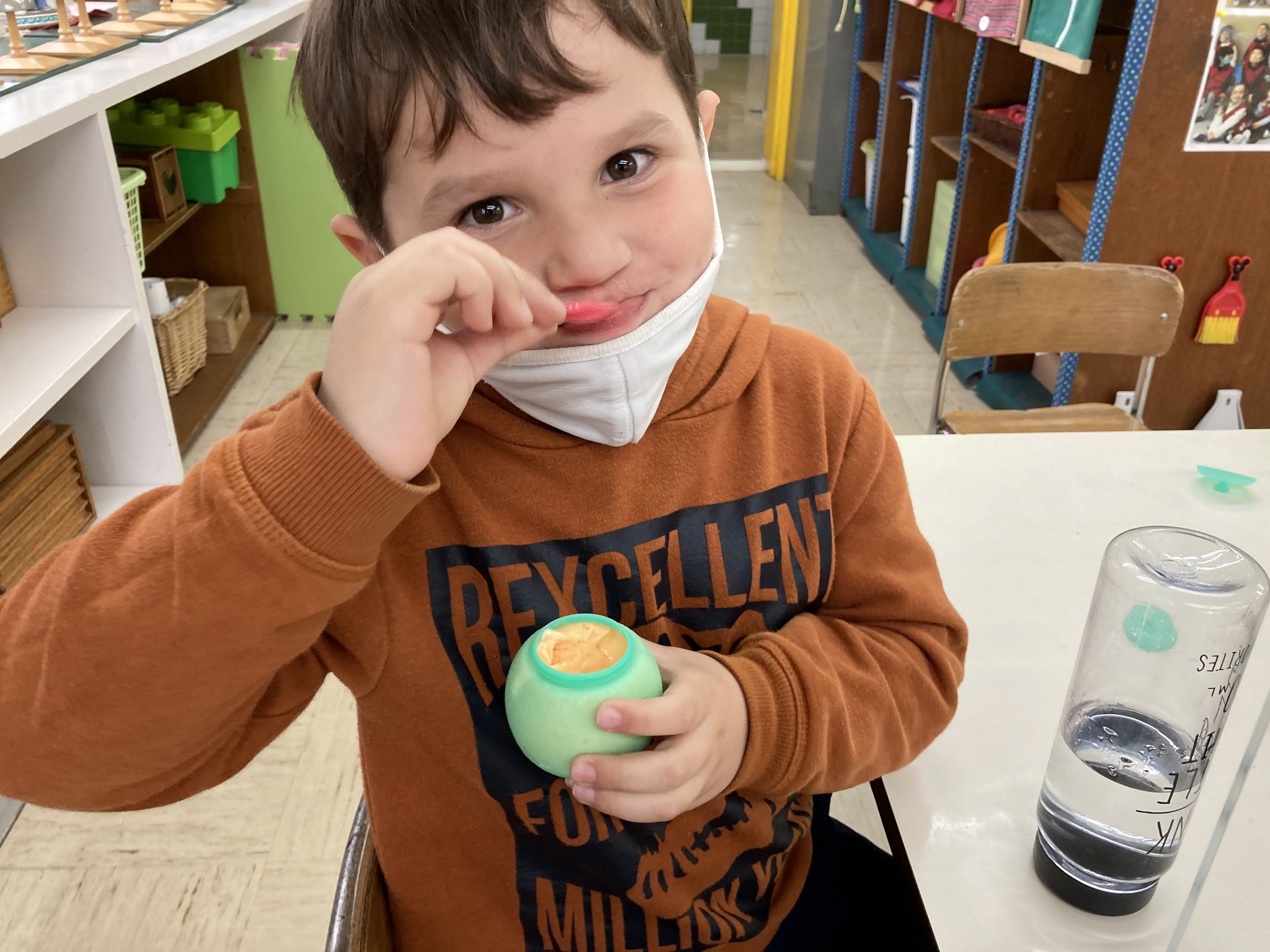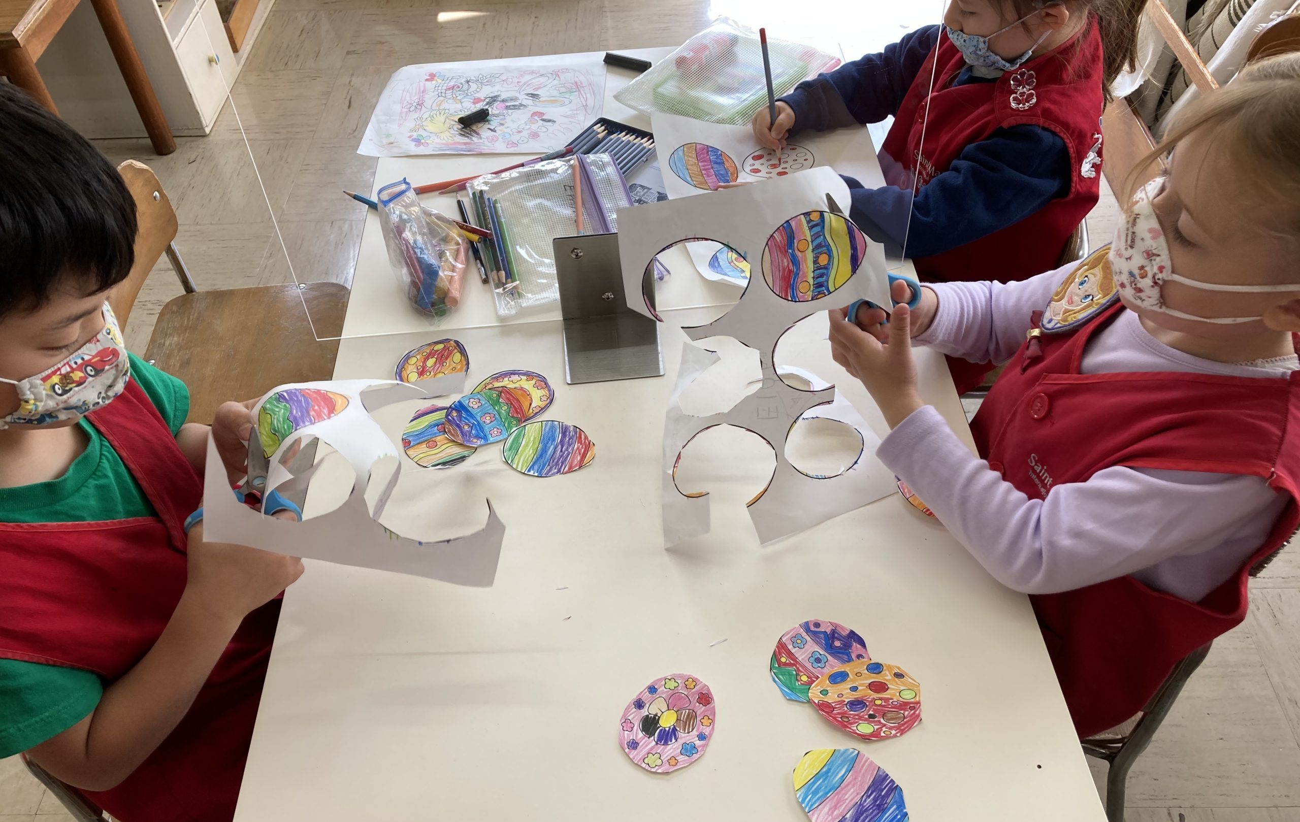 When the children were eating lunch, they knew that they had to eat in silence since they took off their masks. As a result, the children developed their own sign language to communicate with each other through the transparent hard-plastic table dividers. How clever and fun!