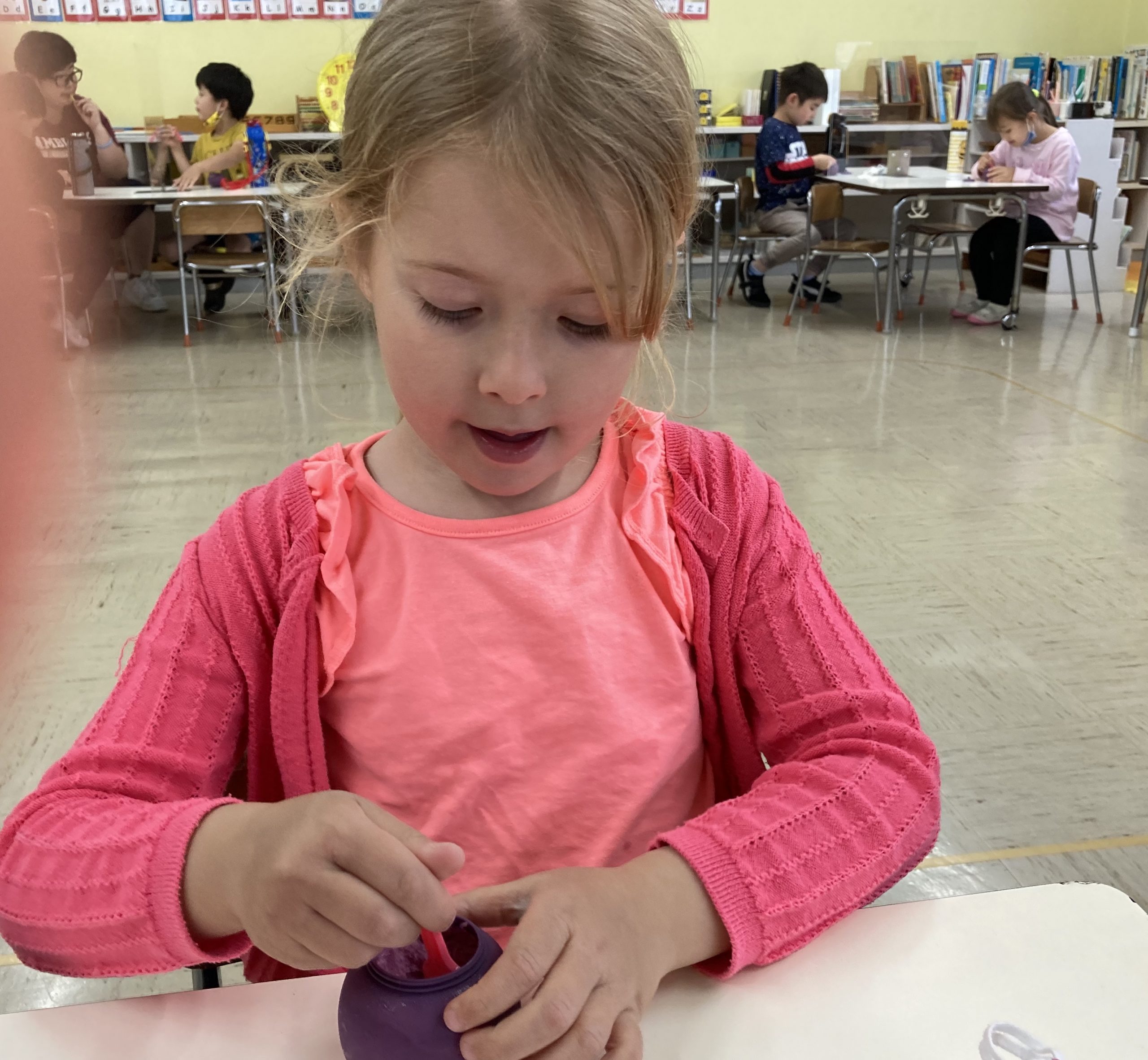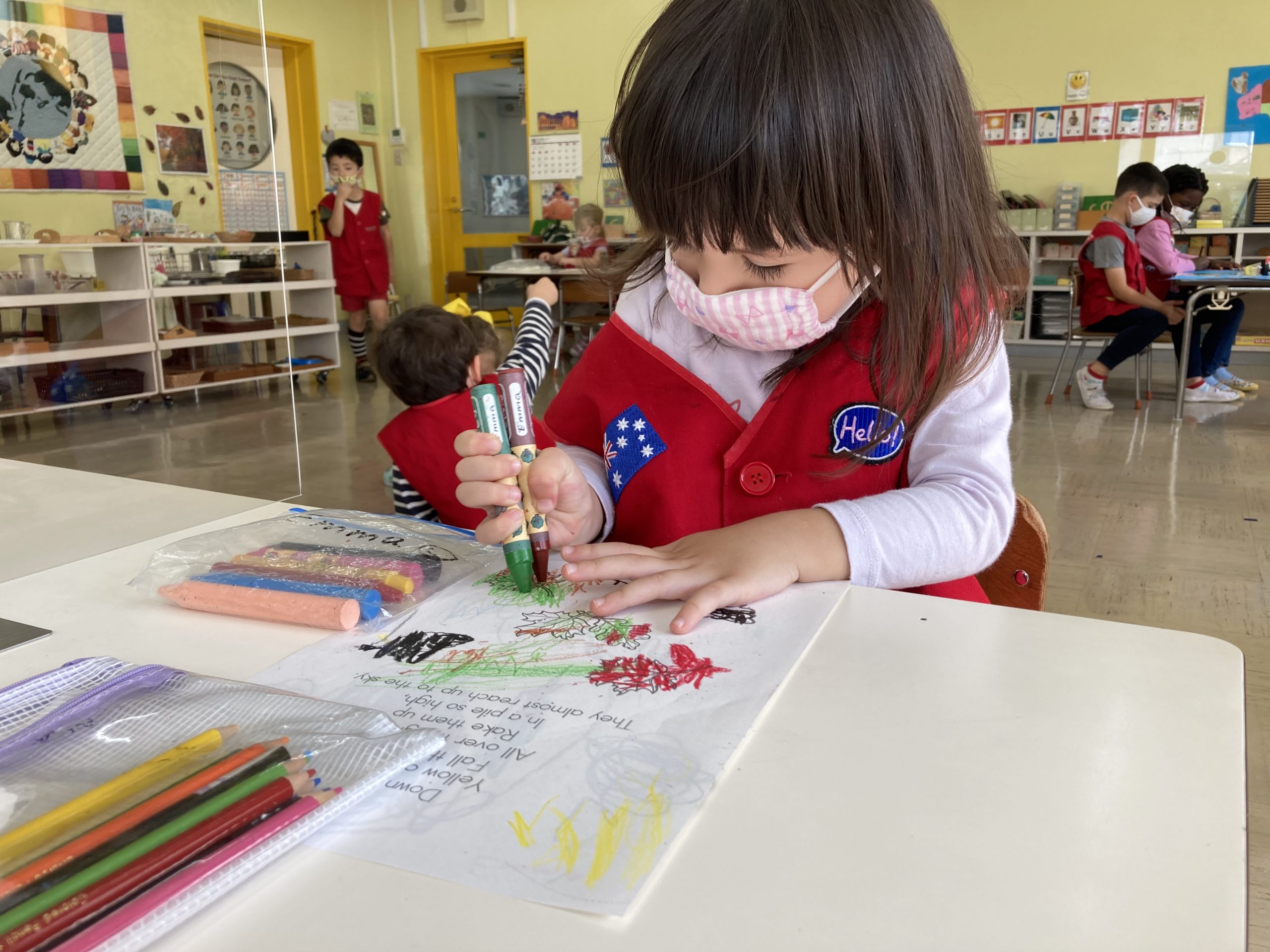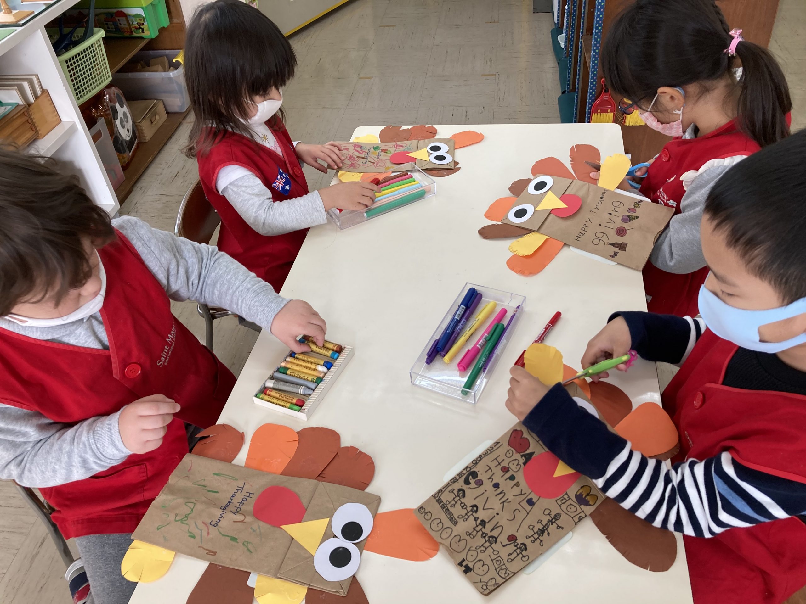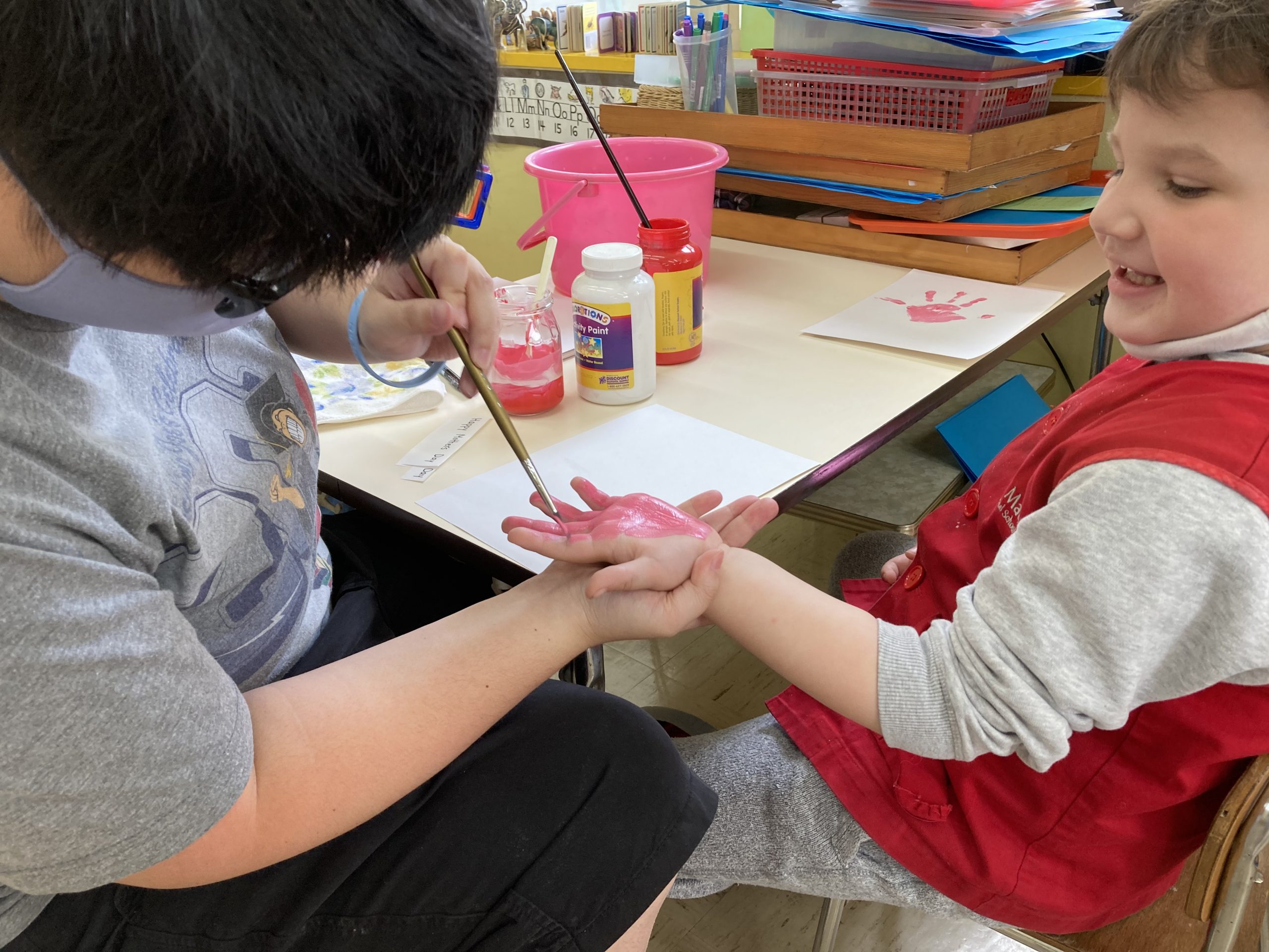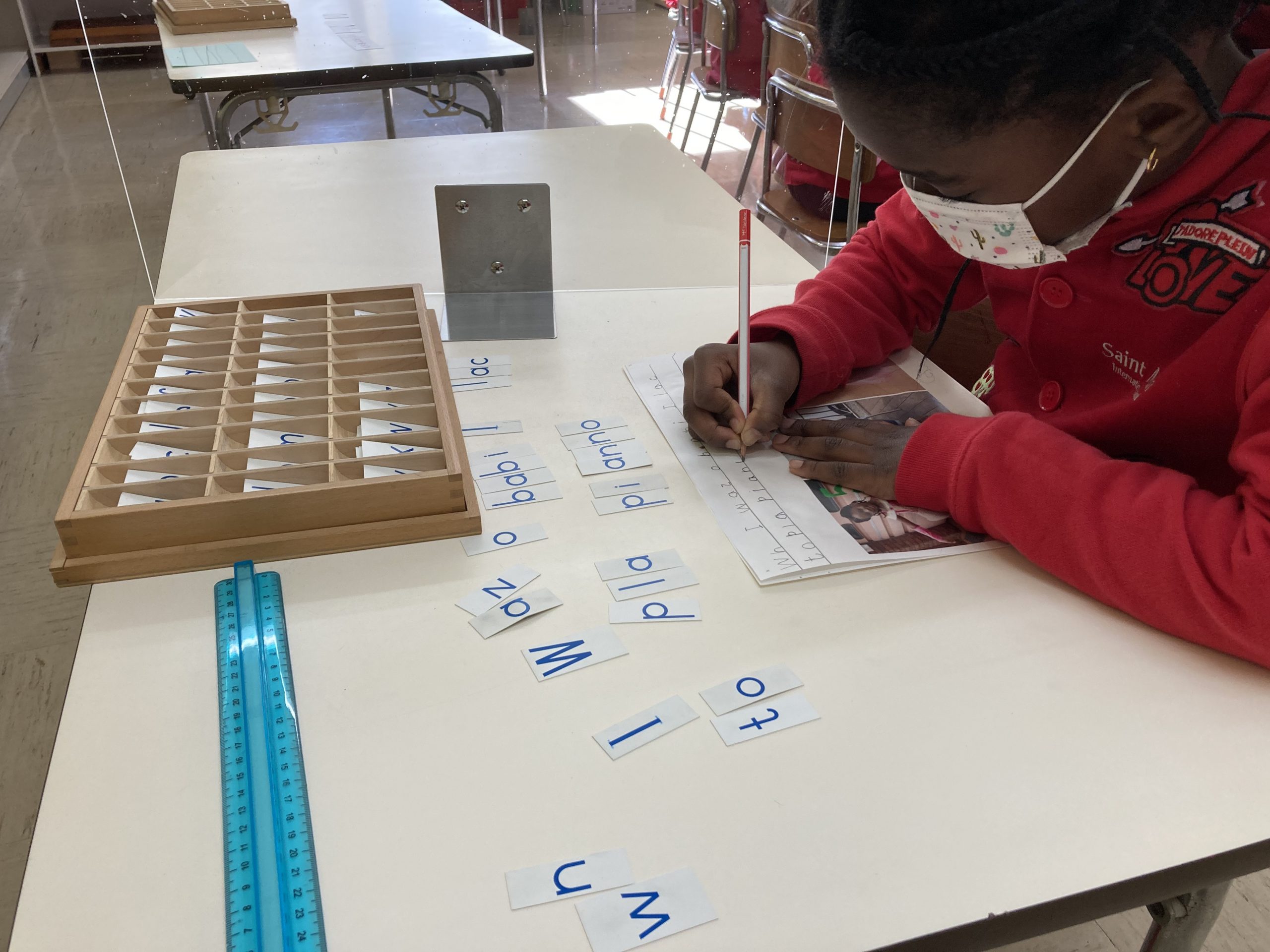 When the children were eating lunch, they knew that they had to eat in silence since they took off their masks. As a result, the children developed their own sign language to communicate with each other through the transparent hard-plastic table dividers. How clever and fun!