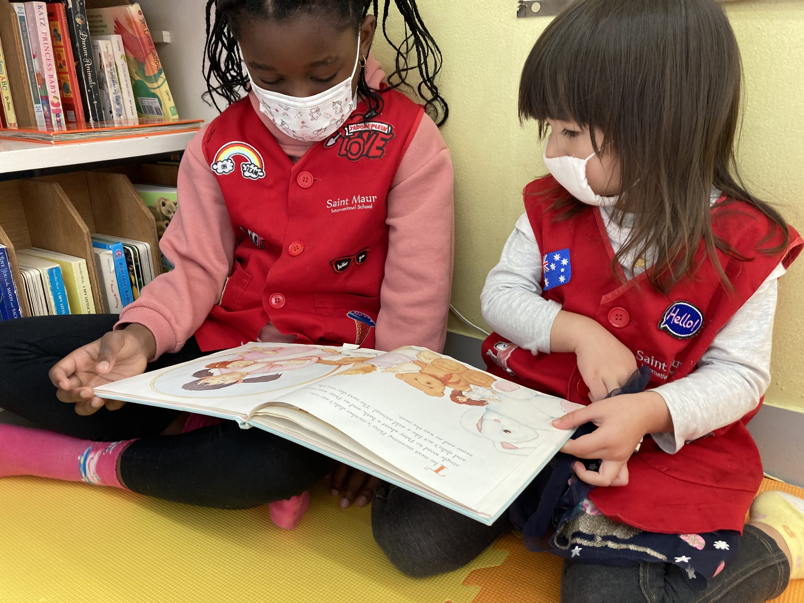 A 6-year-old reading a book to a younger child. He is also explaining to her about the picture of a butterfly.