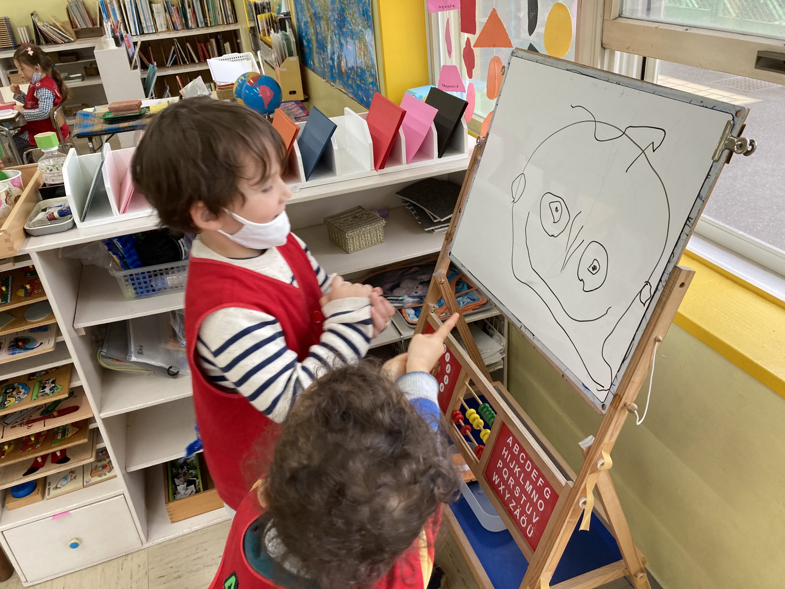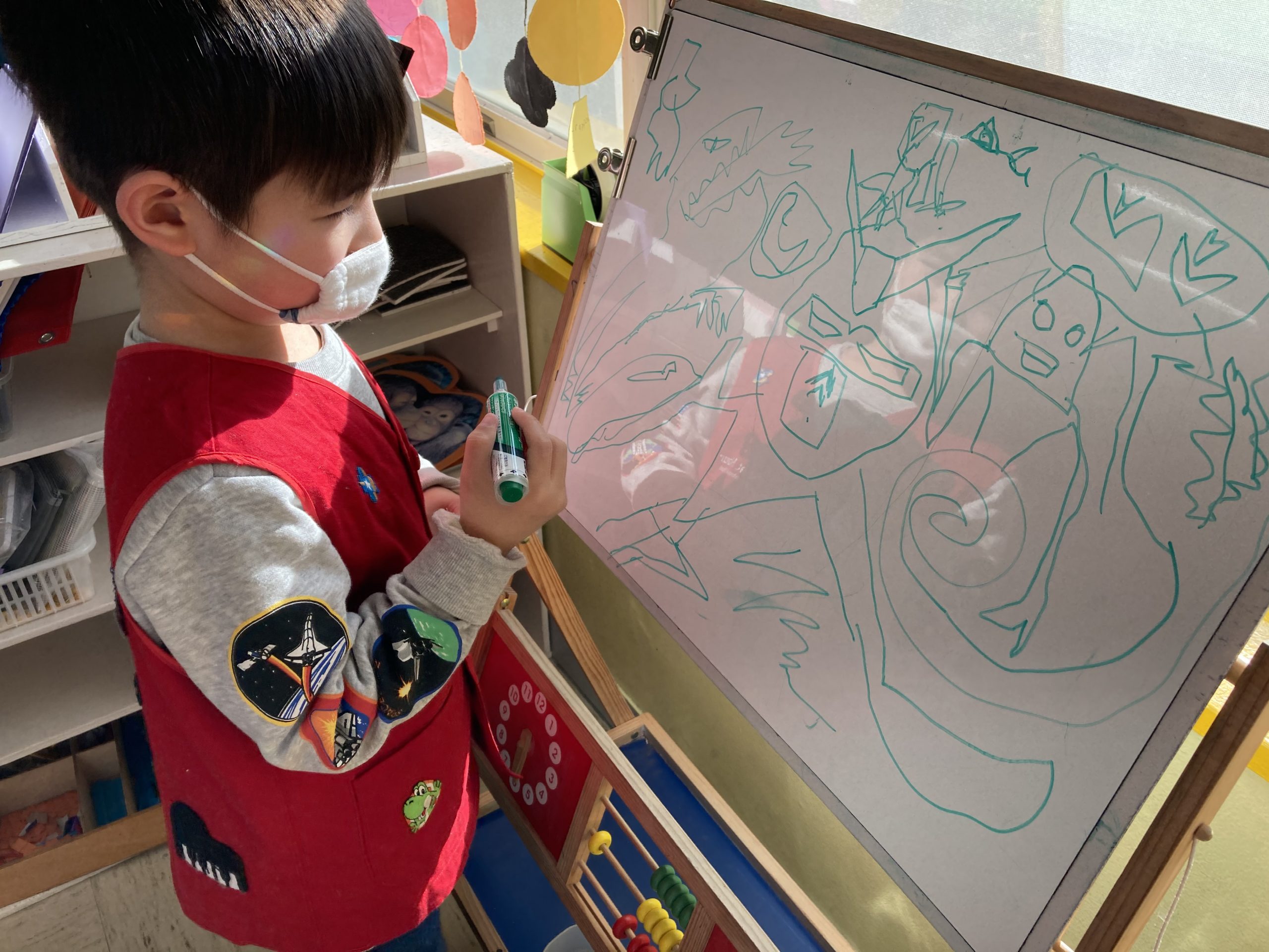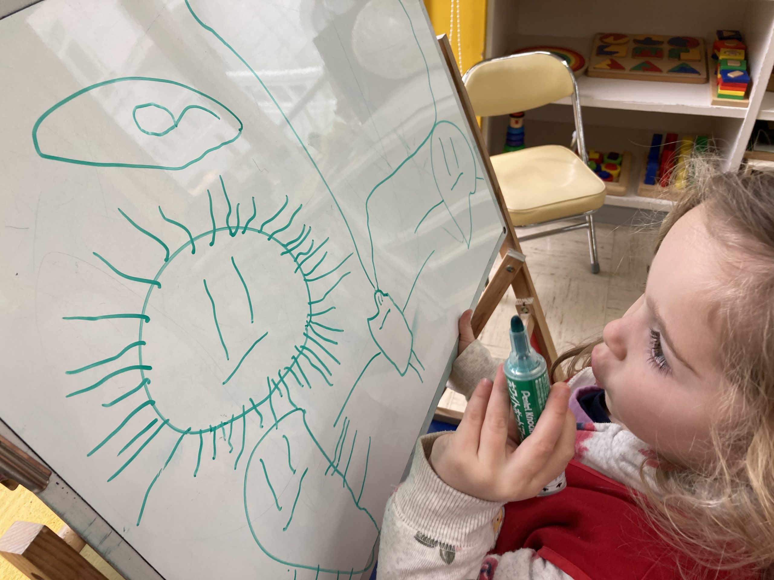 Drawing on the easel: Not only do children write words and sometimes stories on the easel, but they also like to express their creativity. This boy is writing about a “Cat Family”. The easel became a place where discussions started.