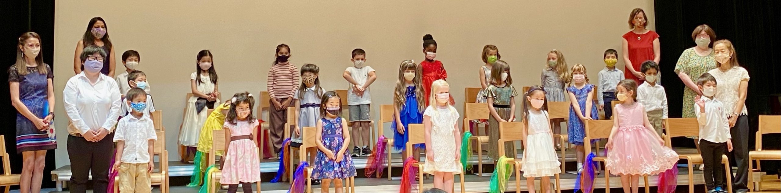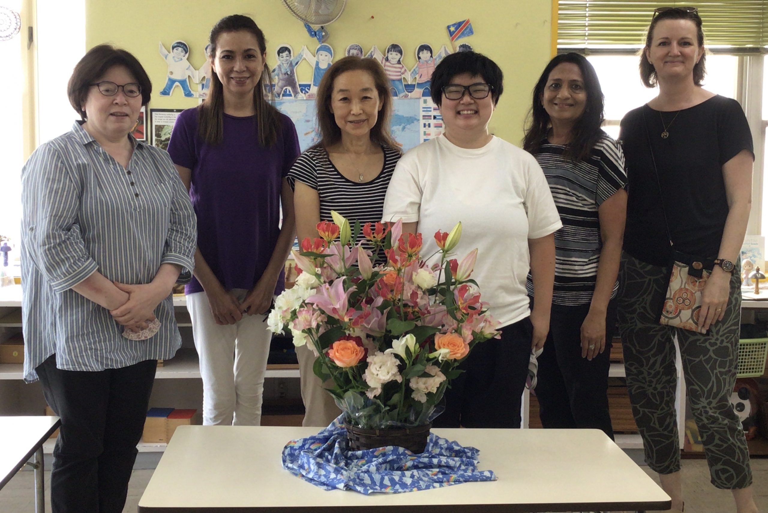 Standing behind the gorgeous basket of flowers from all of our children’s families, the Montessori team of the 2020-21 school year would like to say “Thank you for the fun times we had together with the children and parents this academic year in the classroom on campus.” It was a real coordinated effort, which also included school staff in the Library and PE, as well as AV / Lighting crew for the Fine Arts Auditorium. Continue to stay safe and well, and have a restful summer vacation. We took off our masks for a quick photo to smile at the camera on the last faculty work week. Please stay cool, and wear your masks whenever outside to stay healthy during the hot summer!