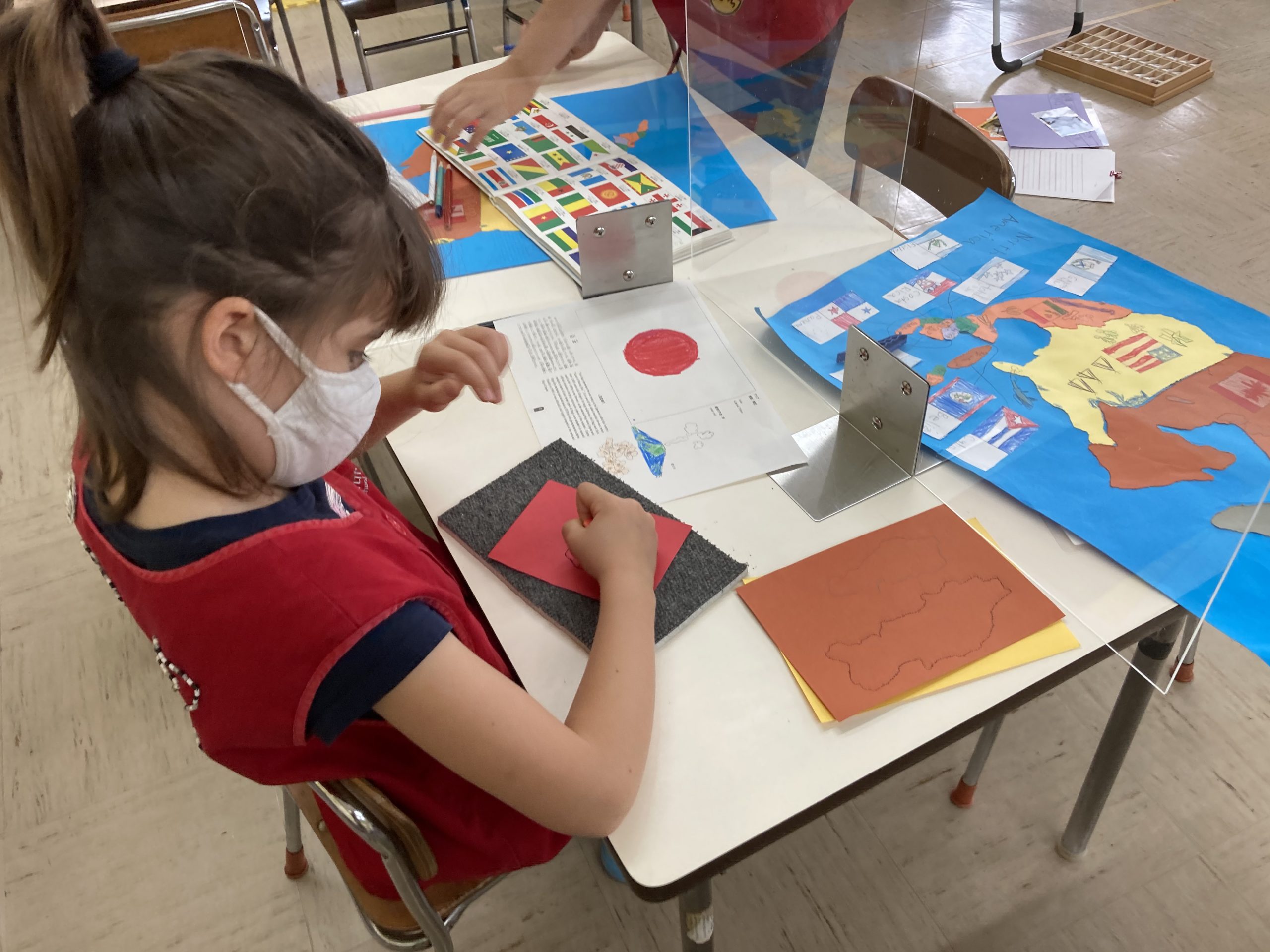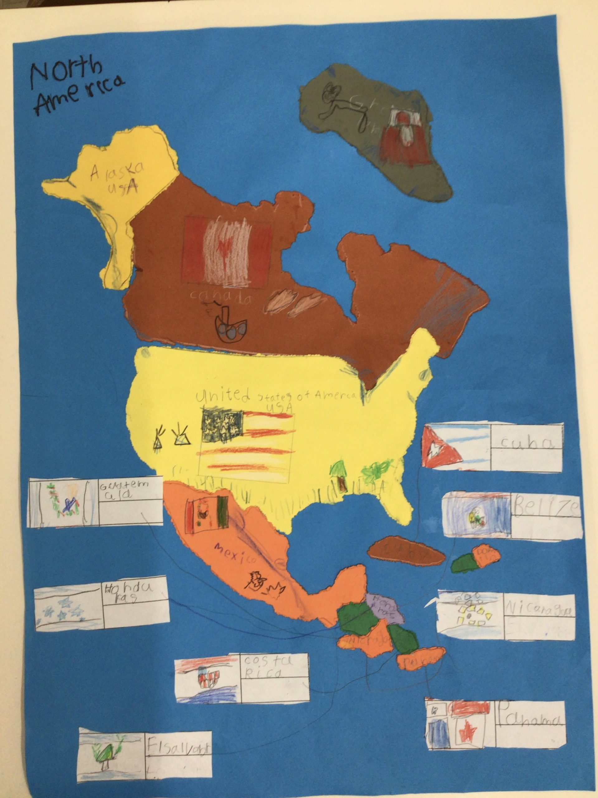 The continent of North America: Discovering the national flag after outlining the country with a pushpin, and pasting the parts together. The children did research along the way.